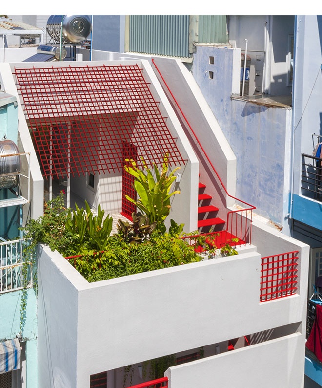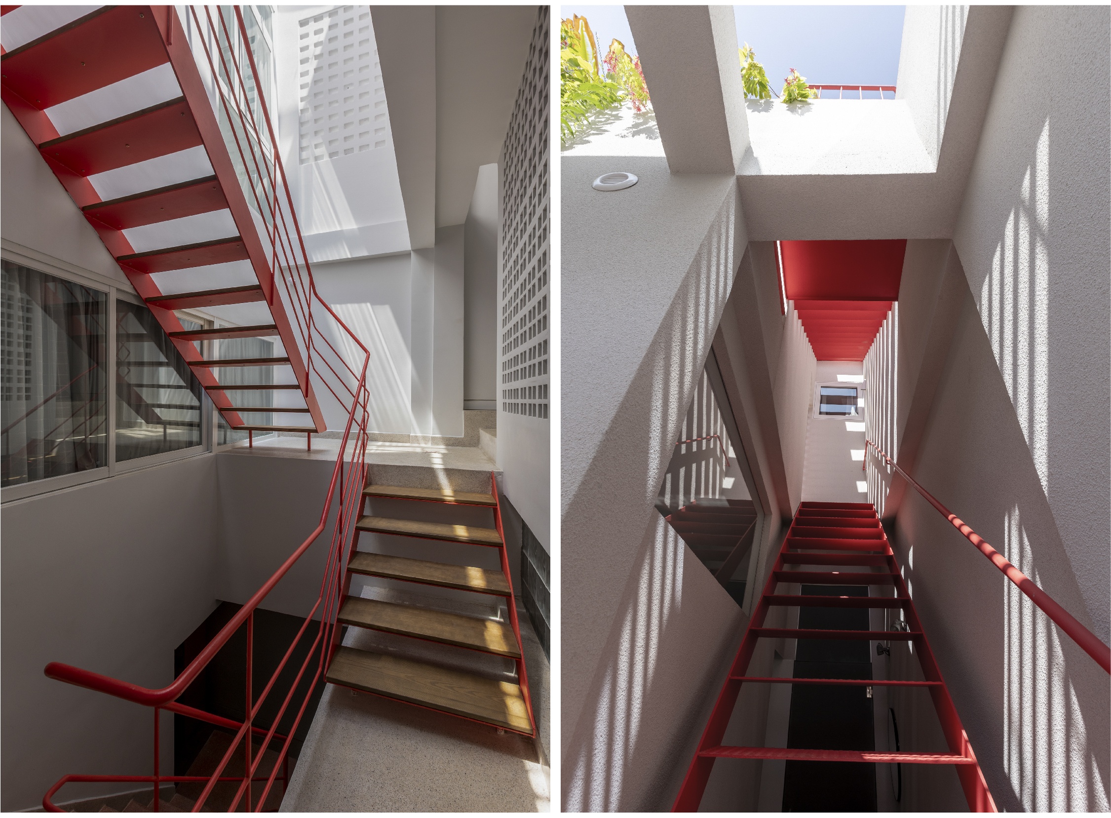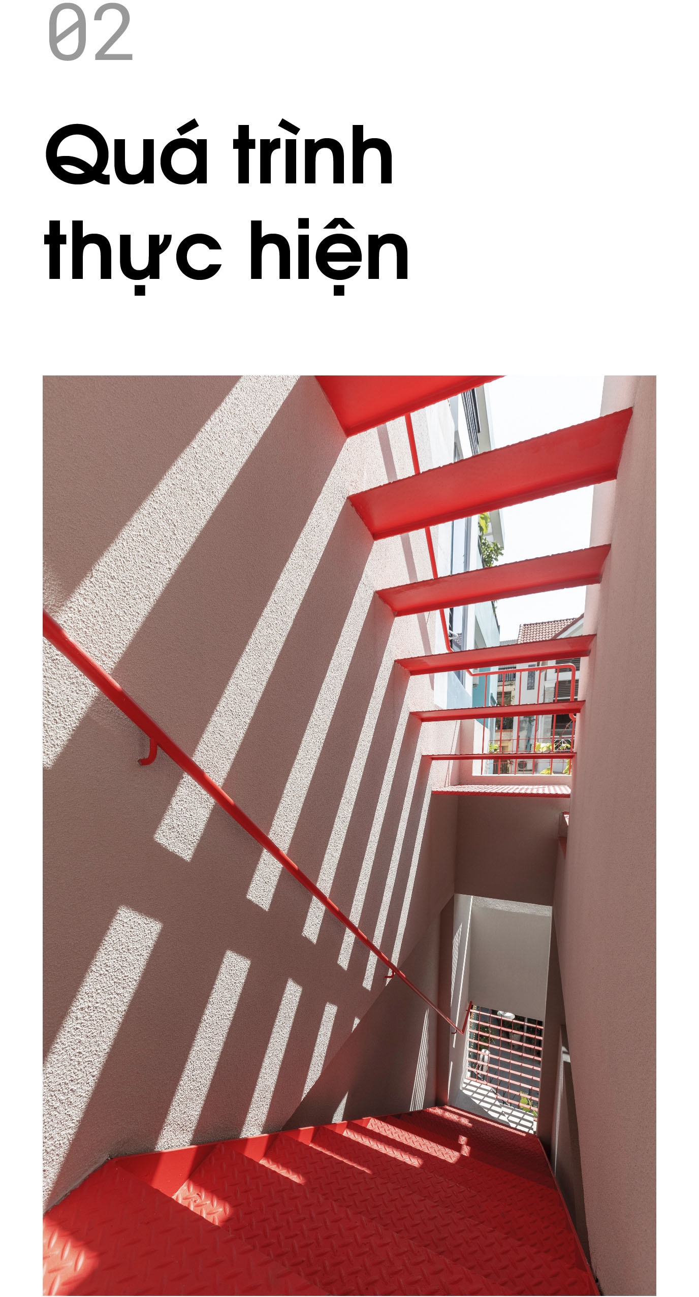 Lấy cảm hứng từ chính chiếc cầu thang đá mài màu đỏ của ngôi nhà - một điều đã gắn bó với kiến trúc sư từ những ngày thơ bé, Minh quyết định chọn hai màu trắng - đỏ làm chủ đạo trong thiết kế.
