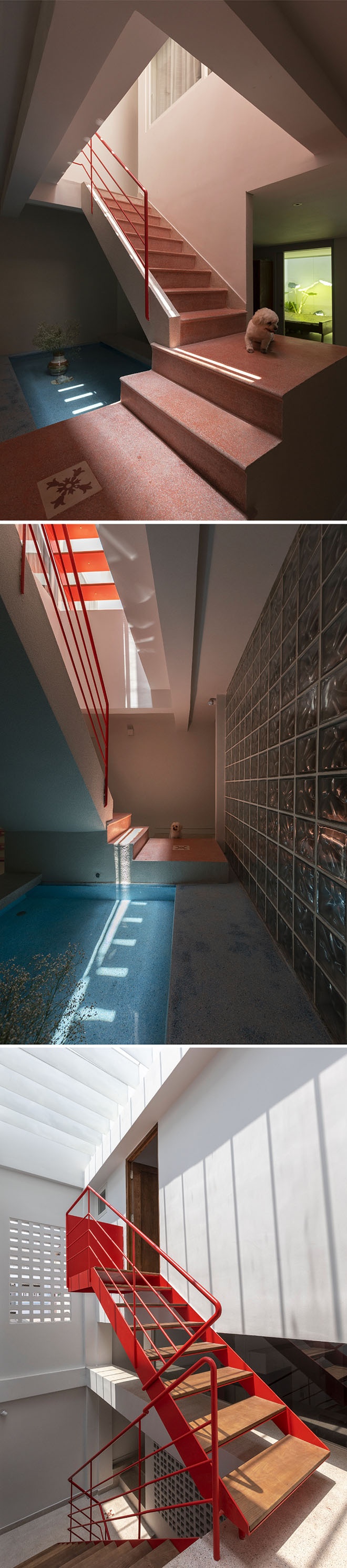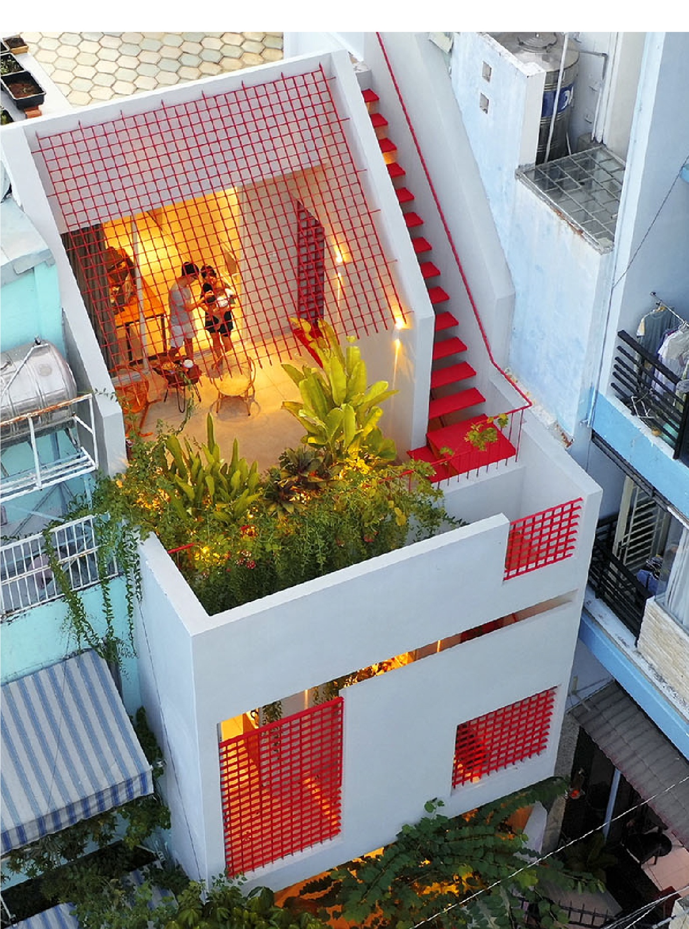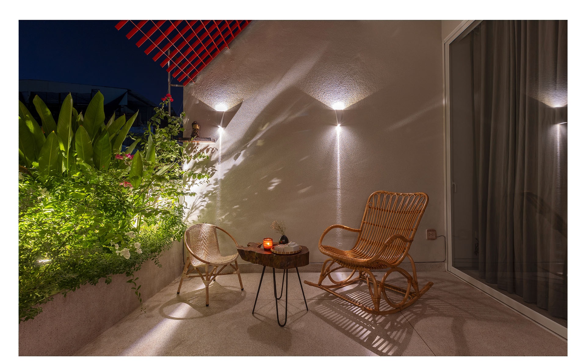 Lấy cảm hứng từ chính chiếc cầu thang đá mài màu đỏ của ngôi nhà - một điều đã gắn bó với kiến trúc sư từ những ngày thơ bé, Minh quyết định chọn hai màu trắng - đỏ làm chủ đạo trong thiết kế.