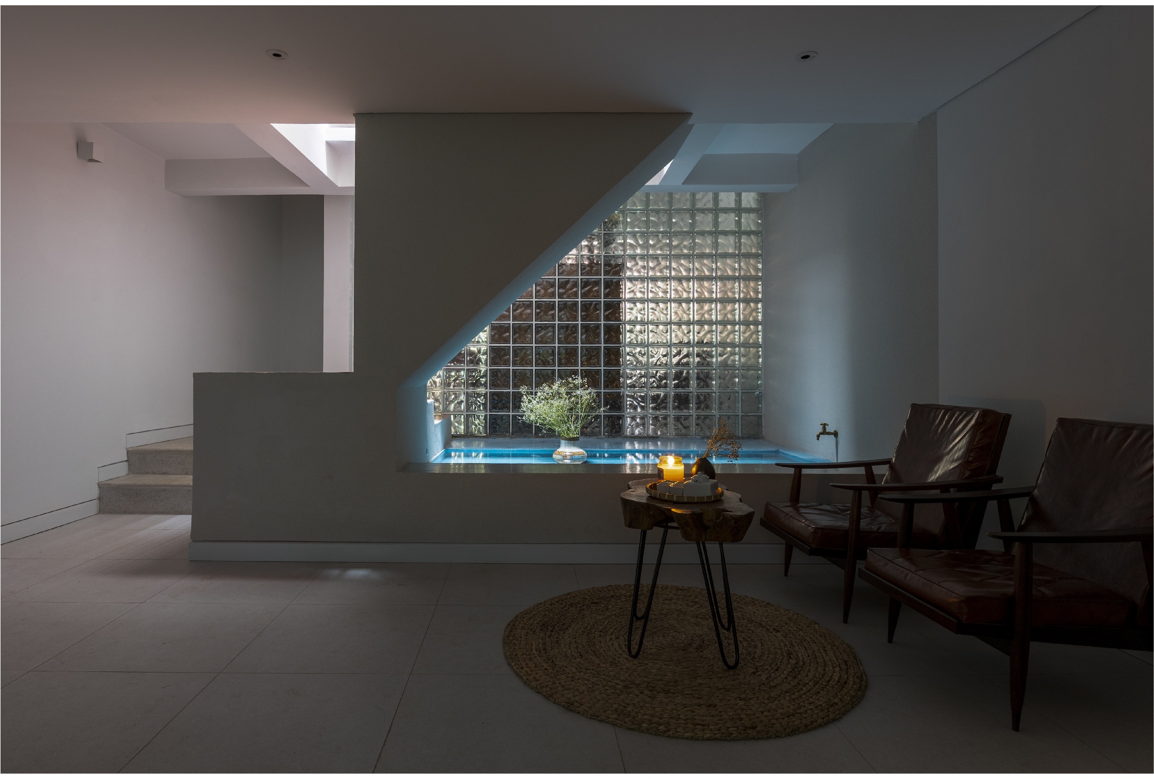 Đầu tiên, Minh cho xây dựng một hồ nước cạn ở vị trí dưới gầm cầu thang - khu vực nhà kho cũ. Việc bổ sung thêm một hồ nước trong nhà như này sẽ gây ra sự chênh lệch áp suất trong không khí. Từ đó có thể hỗ trợ quá trình thông gió tốt hơn.