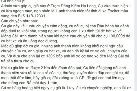 Theo như fanpage này chia sẻ, cụ già này đã kể bị con dâu hành hạ, đuổi ra khỏi nhà, trong người không có tiền để đi xe. Một anh thanh niên sau khi nghe cụ kể chuyện đã cho cụ 130.000 đồng để đi lại và ăn uống dọc đường. Số tiền này được anh thanh niên đưa cho lái xe và dặn lái xe khi nào đến nơi thì trả lại cho cụ tiền thừa.
