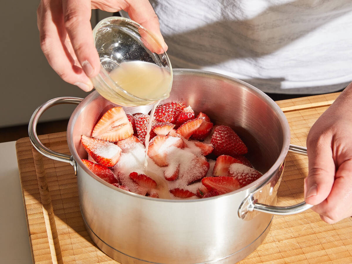 - Chuyển dâu tây vào nồi, trộn với đường và nước cốt chanh.
