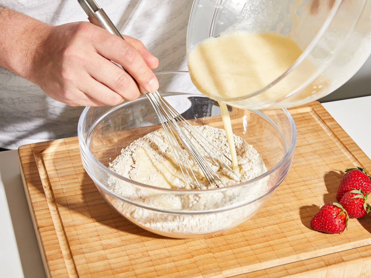 - Thêm nguyên liệu ướt vào nguyên liệu khô và trộn đều.