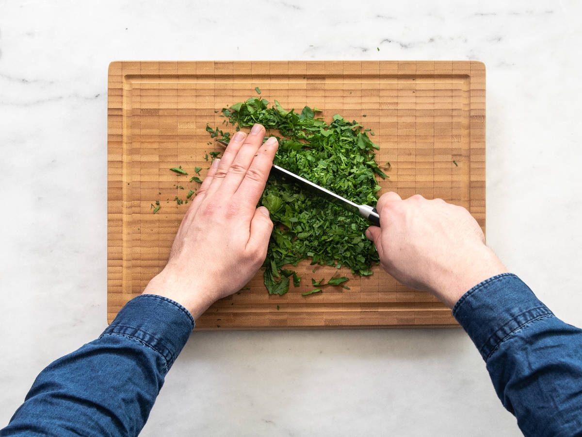 - Băm nhuyễn ngò tây, cắt nhỏ tỏi, cắt đôi quả cà chua bi.