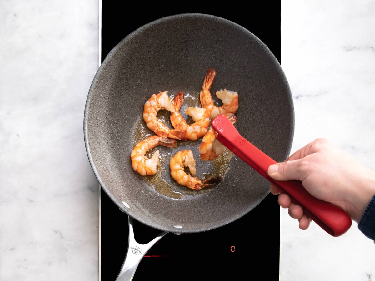 - Đun nóng chảo lớn trên lửa vừa, thêm dầu thực vật và chiên tôm khoảng 2 phút rồi lấy ra khỏi chảo.