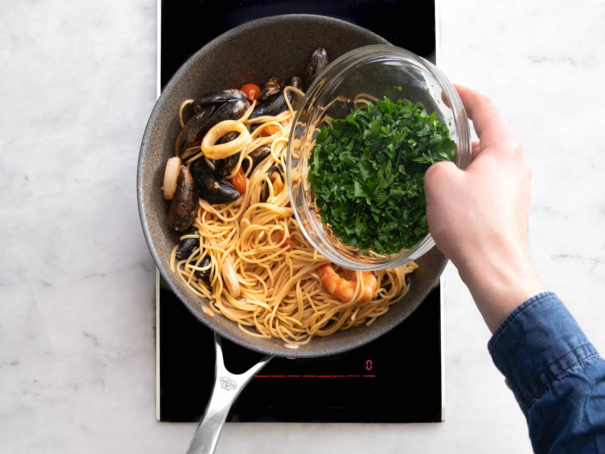 - Cho mì Ý và tôm vào chảo trên, thêm mùi tây rồi đảo đều.
