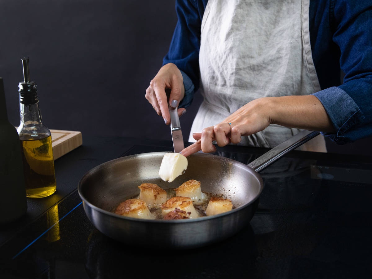 - Lật mặt sò, thêm một ít bơ rồi vớt ra.