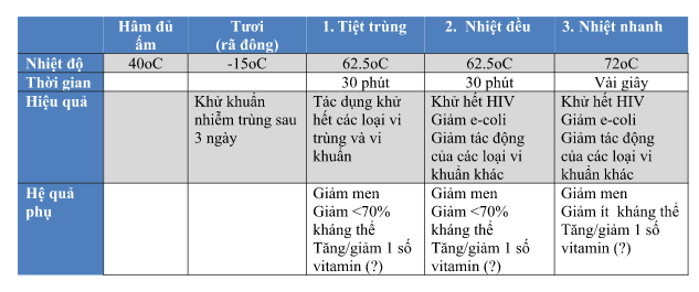 Phương pháp phổ biến và dễ thực hiện nhất là tiệt trùng sữa ở nhiệt độ 62.5 độ C trong vòng 30 phút để rã đông và khử tất cả các vi khuẩn.