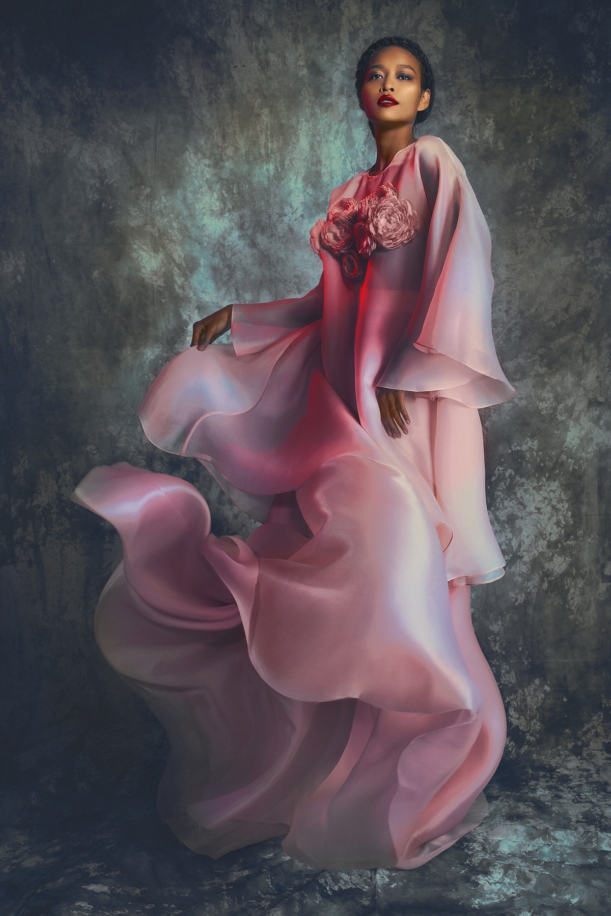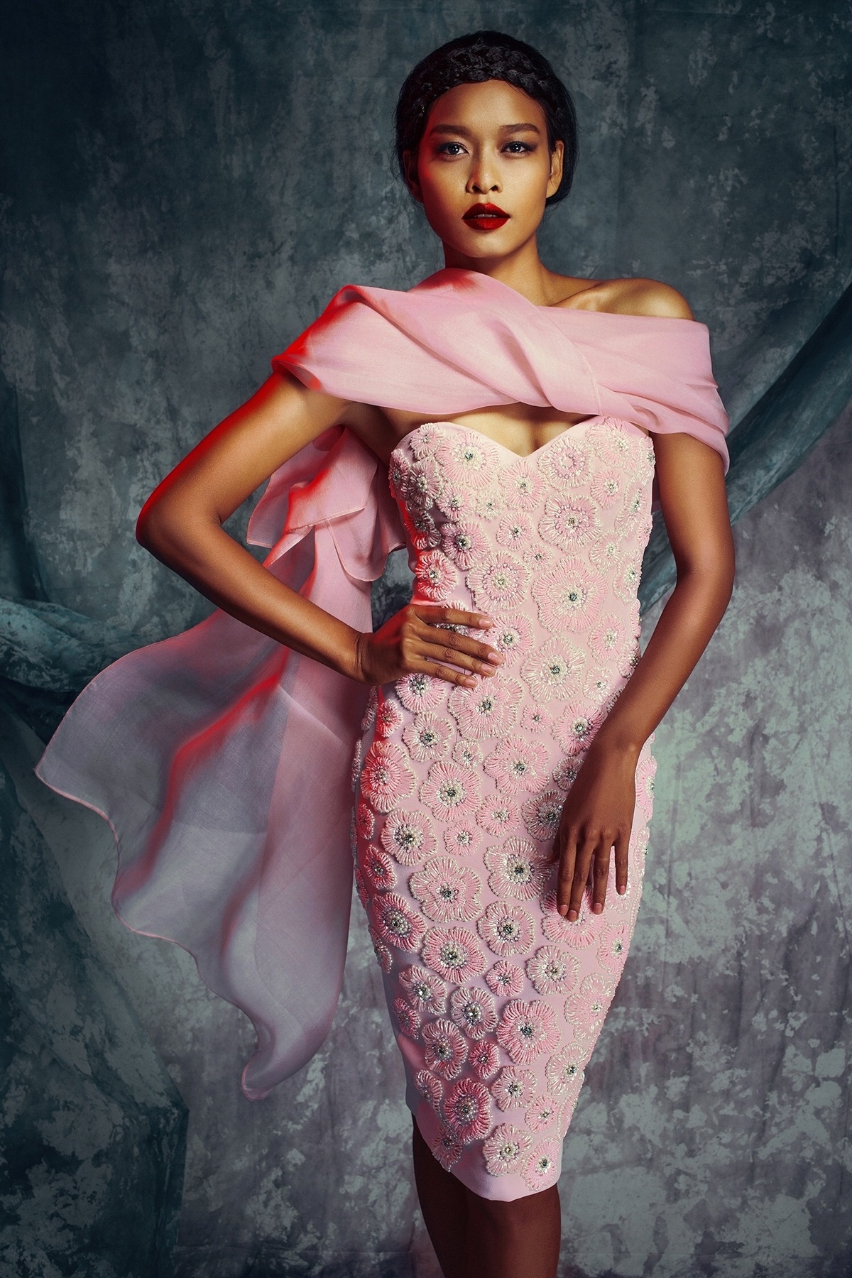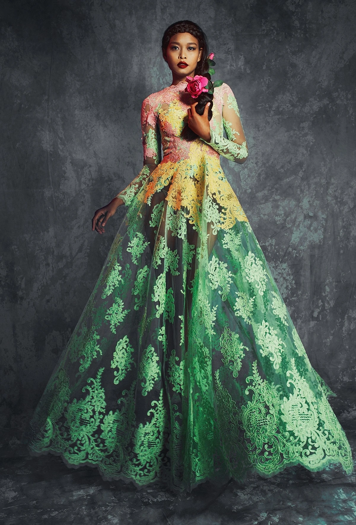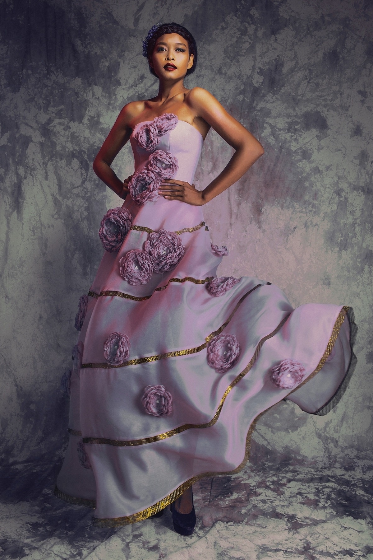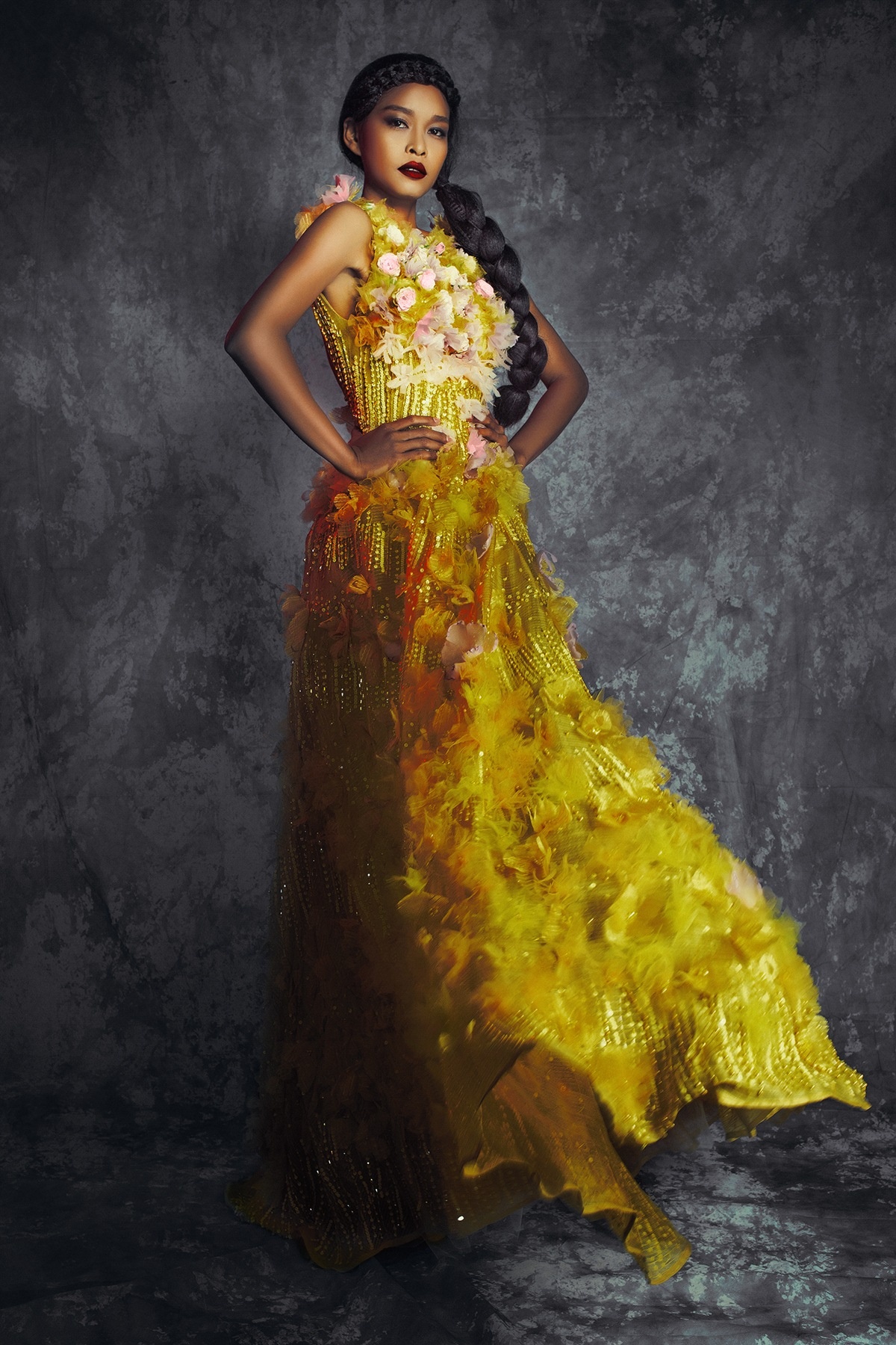 Nữ người mẫu sở hữu làn da nâu bánh mật bỗng nữ tính, nền nã và không kém phần lộng lẫy trong những bộ váy dạ hội cao cấp của NTK Lý Qúi Khánh.