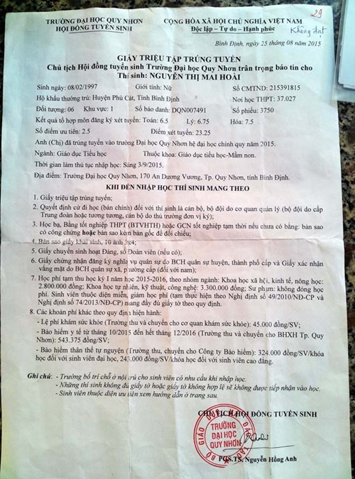 Ngày 3/9 trường gửi giấy báo triệu tập trúng tuyển đến trường để làm thủ tục nhập học. Nhưng khi đưa con gái đến làm thủ tục thì được thông báo không đủ điểm đậu vì không được cộng thêm 1 điểm của đối tượng ưu tiên 06. “Nếu như từ đầu lúc xét tuyển không chấp nhận thì cho biết để con tôi còn xét tuyển các trường khác như ĐH Phú Yên, CĐ Bình Định có cơ hội đậu cao hơn, đằng này dở dang hết, cũng không còn cơ hội nào”, ông Thanh chua xót, nói.