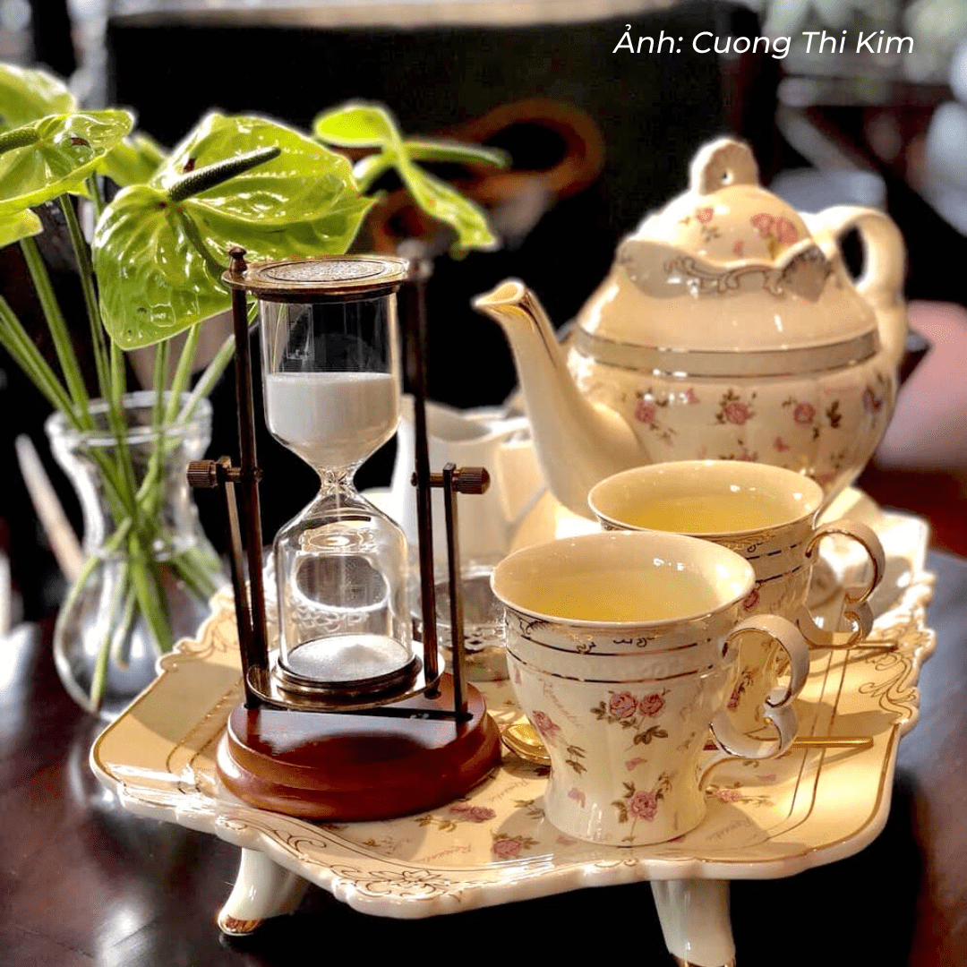 Trà được phục vụ trong những bộ ấm trang nhã. Bạn cũng có cơ hội nhâm nhi bánh ngọt thơm mềm.