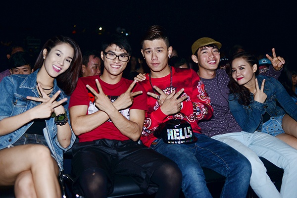 Diệp Lâm Anh, Lâm Vinh Hải, Quang Đăng và cô bạn thân Huỳnh Mến thích thú xem các thí sinh biểu diễn. |