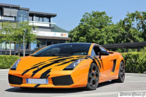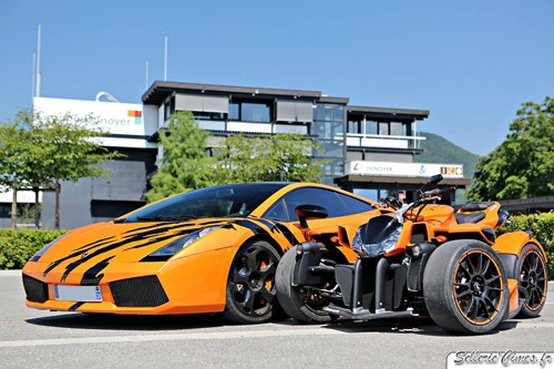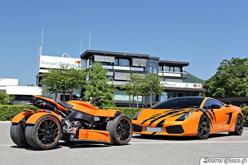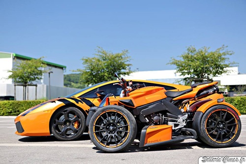 | Siêu xe Lamborghini Gallardo và mô tô độ Lazareth Wazuma. |
