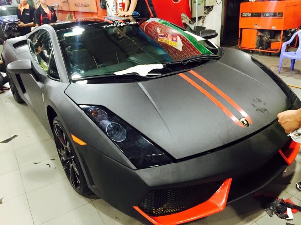 Siêu xe Lamborghini Gallardo SE độc nhất Việt Nam vừa được chủ nhân chuyển màu từ vàng - đen sang đen mờ. Những người thợ đã phủ lên xe một lớp decal khá tinh vi. Thân xe được tạo điểm nhấn bằng hai sọc màu cam dọc nắp ca-pô và cánh gió trước.