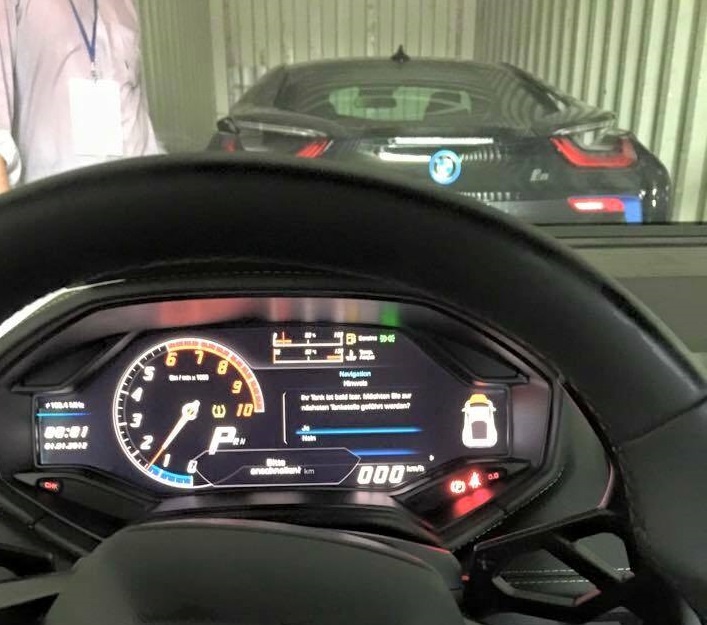 | Xe thể thao BMW i8 nhìn từ cabin Huracan trong container tại cảng. Ảnh: Johnson Taylor. |