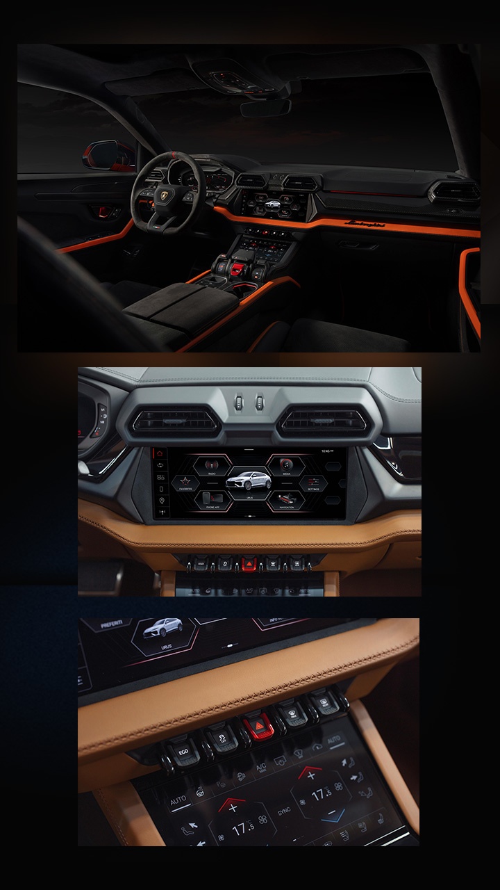 Đi vào nội thất, khoang cabin cũng được thay đổi nhằm nhấn mạnh DNA thiết kế của Lamborghini: Xem người lái như một phi công. Màn hình lớn hơn (12,3 inch) được lắp đặt ngay giữa bảng điều khiển cùng phiên bản Human Machine Interface (HMI) mới với đồ họa cập nhật trực quan hơn, tương tự phiên bản trên chiếc Revuelto. Bảng điều khiển được thiết kế lại với các nút bấm cơ học cho phép tăng trải nghiệm xúc giác sử dụng, chân thật và gần gũi hơn.