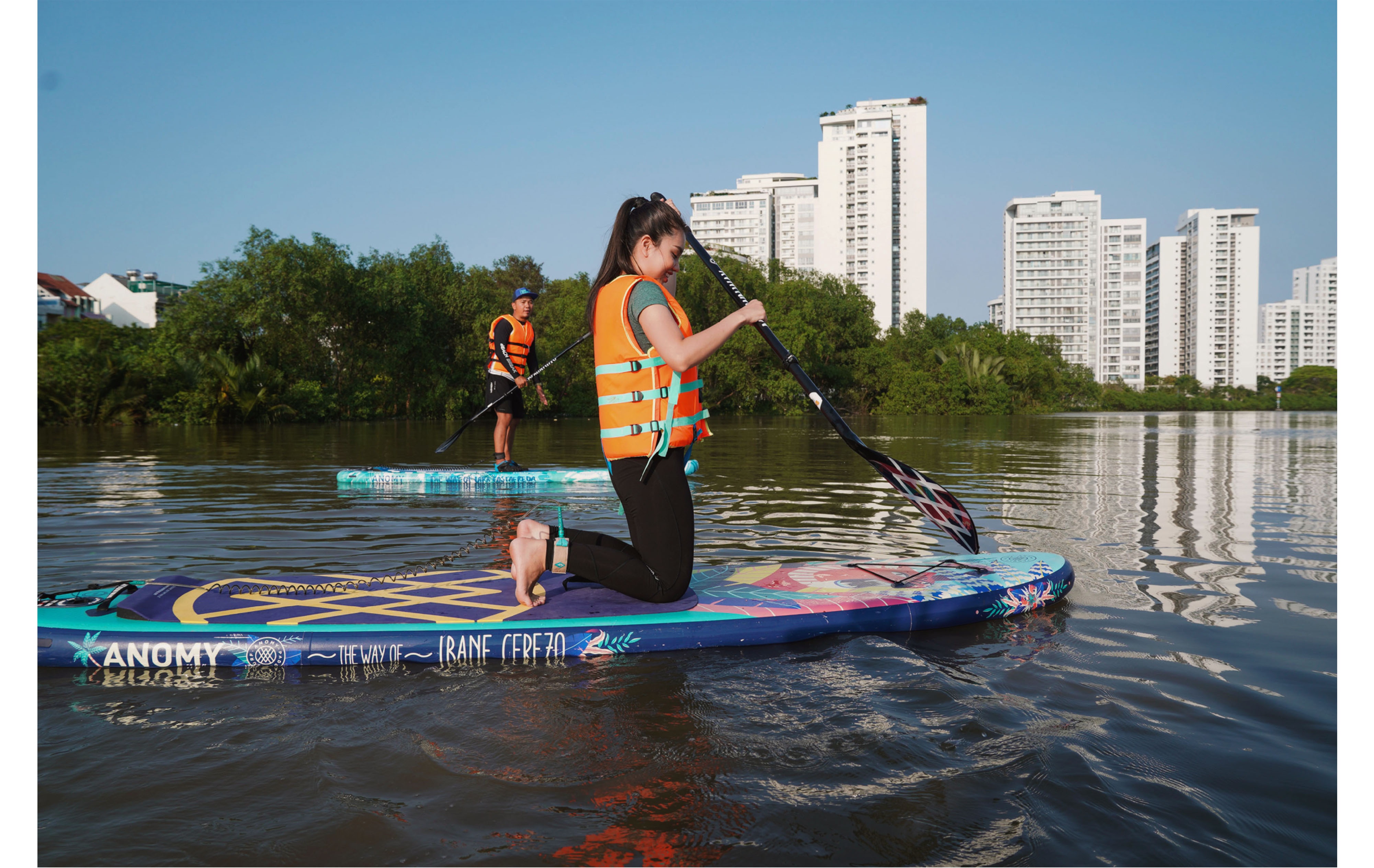 Như nhiều người chơi lần đầu, tôi chọn chèo thư giãn để vừa trải nghiệm bộ môn, vừa ngắm Sài Gòn dưới góc nhìn mới lạ.