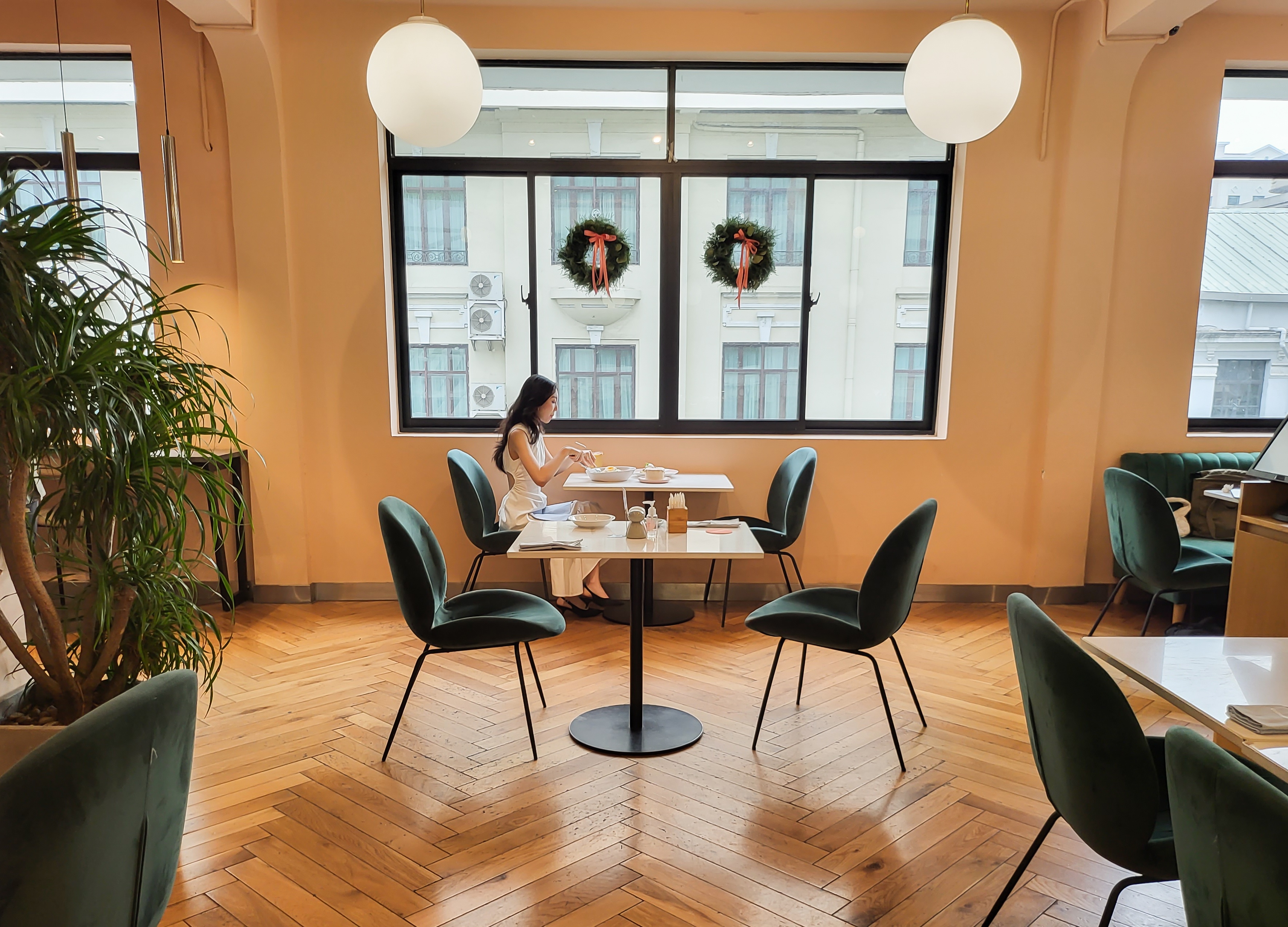 Ấn tượng đầu tiên khi tôi bước vào nhà hàng là những ô cửa sổ rộng ngập tràn ánh nắng, có thể phóng tầm mắt ra xa ngắm nhìn khung cảnh nhộn nhịp của trung tâm thành phố.