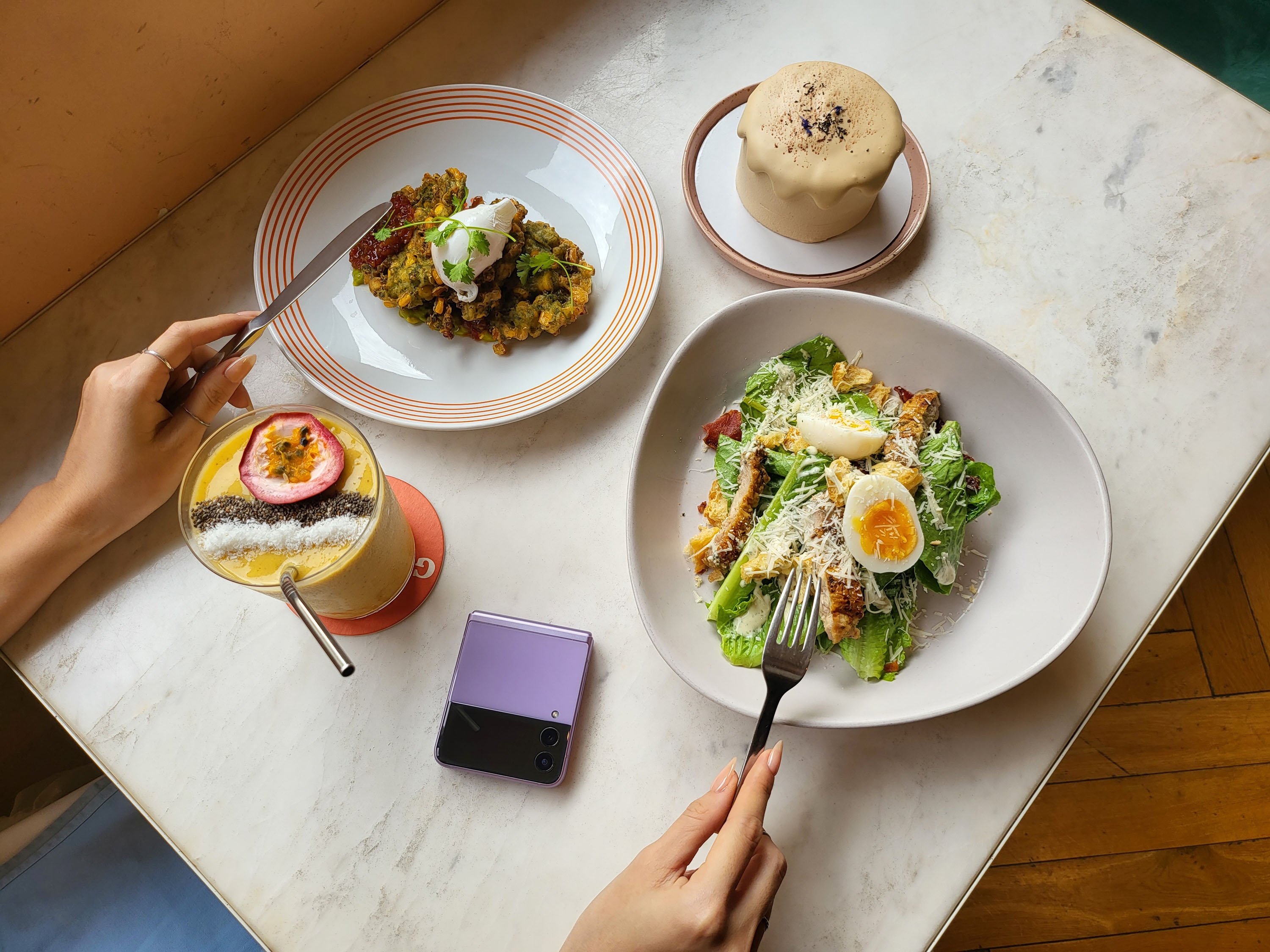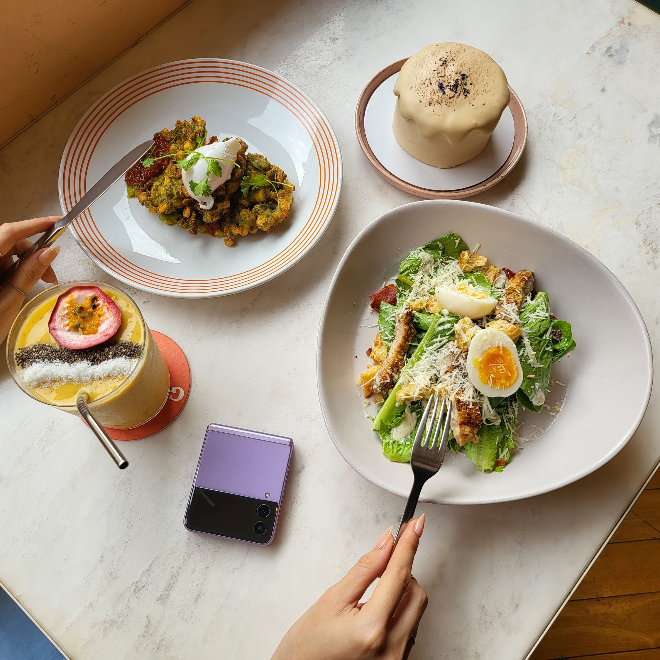 Tạm kìm nén cơn đói, tôi dành chút thời gian chụp lại bữa ăn thú vị này để review cho bạn bè. Nhờ tính năng chụp thức ăn sẵn có trên Samsung Z Flip3, tôi không mất nhiều thời gian chỉnh sửa ảnh mà ngay lập tức đăng hình lên Facebook, cảm giác như livestream trực tiếp “bữa trưa vui vẻ” của mình vậy.