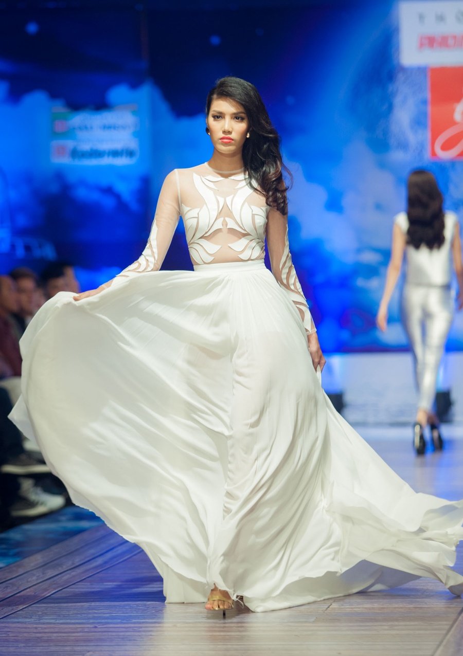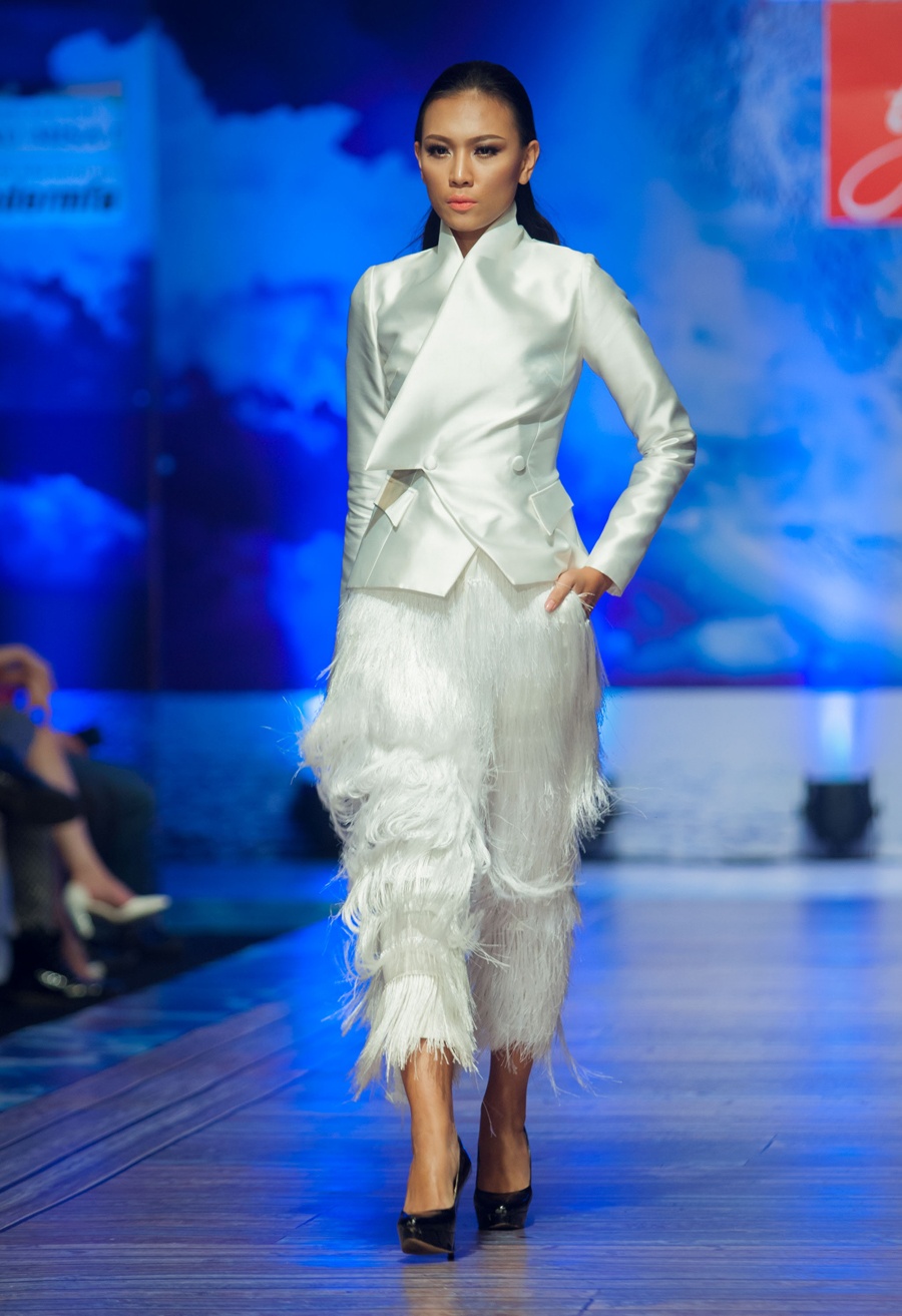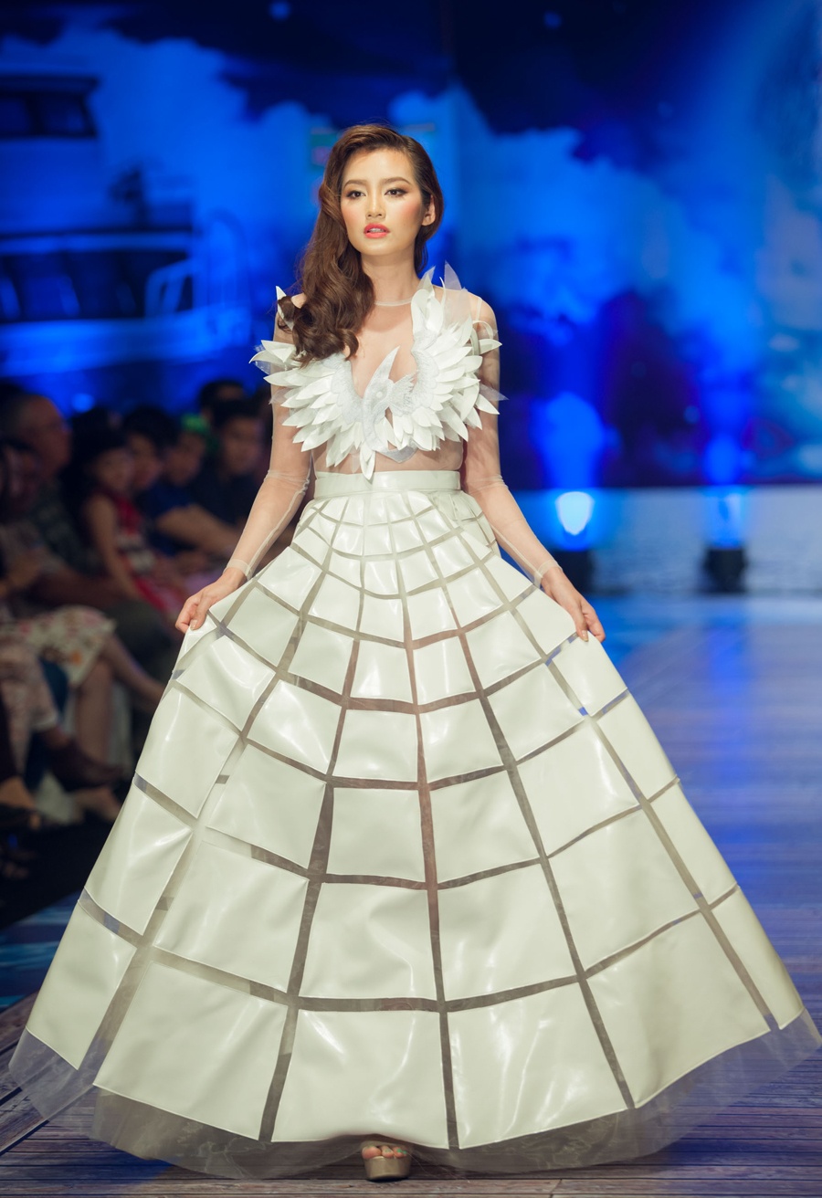 | Vedette Trúc Diễm đảm nhận trình diễn bộ cánh ấn tượng và độc đáo nhất. Thiết kế trắng, tạo khối bằng mảnh ghép chất liệu được NTK Huy Trần đầu tư về ý tưởng và thời gian thực hiện. |