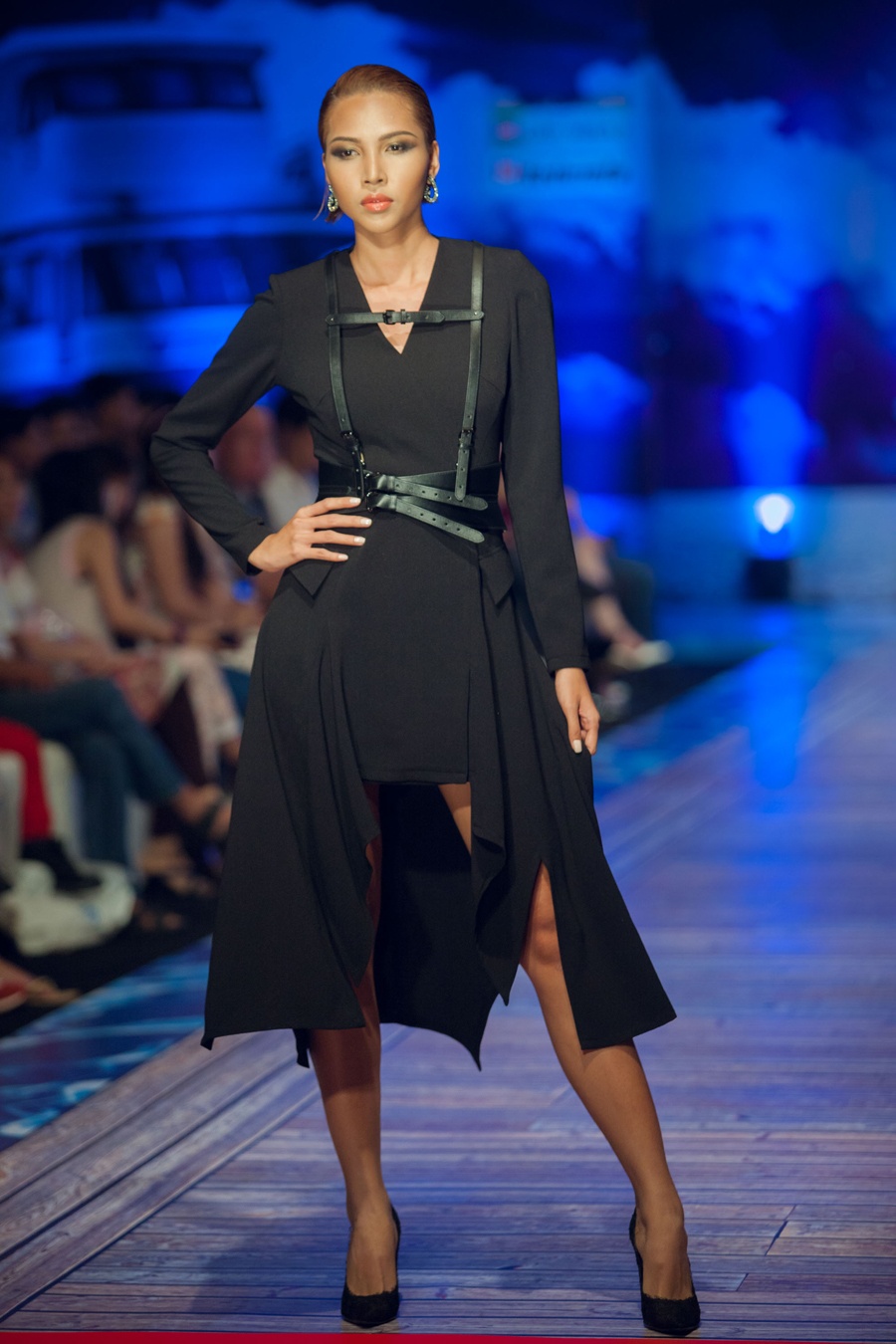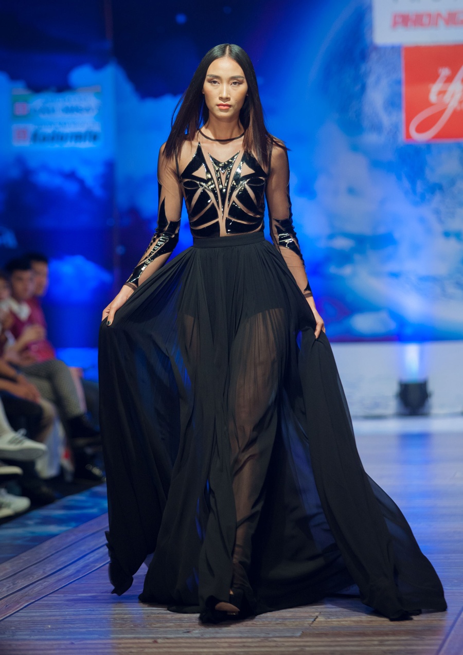 Bộ sưu tập mới của Huy Trần hướng đến phong cách thời trang dự tiệc và ứng dụng. Tông màu chủ đạo trắng đen, đường nét dứt khoát. Chất liệu chính là da, voan mỏng và vải ánh nhũ.