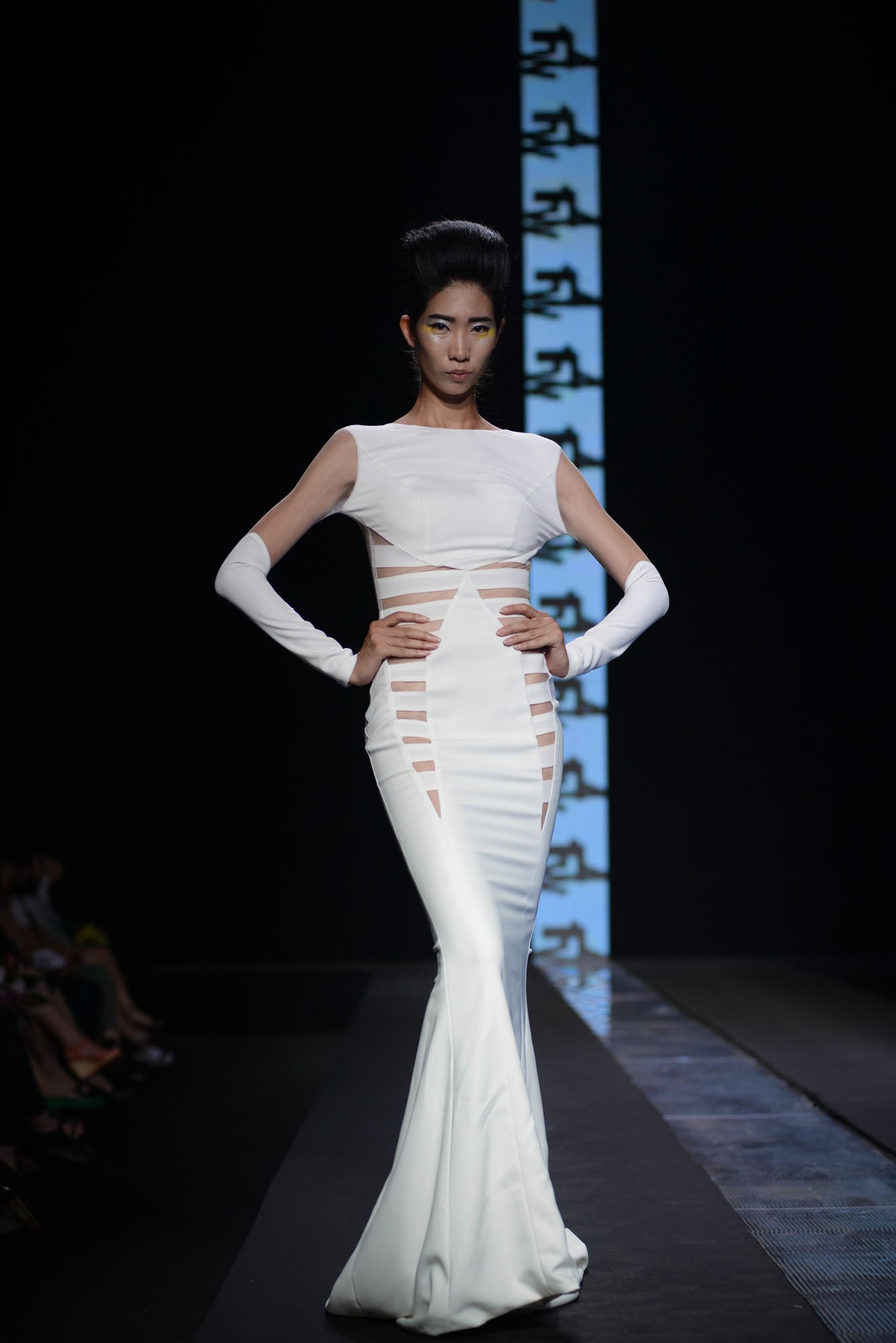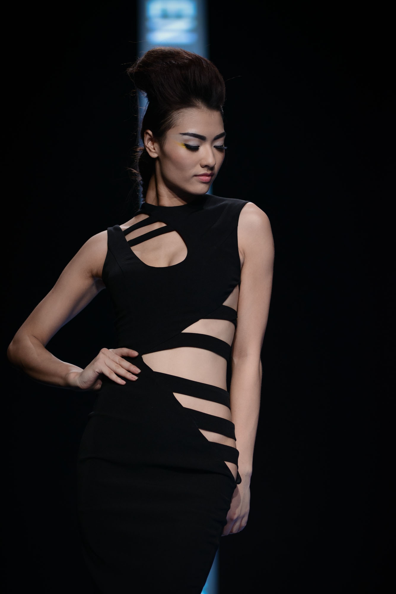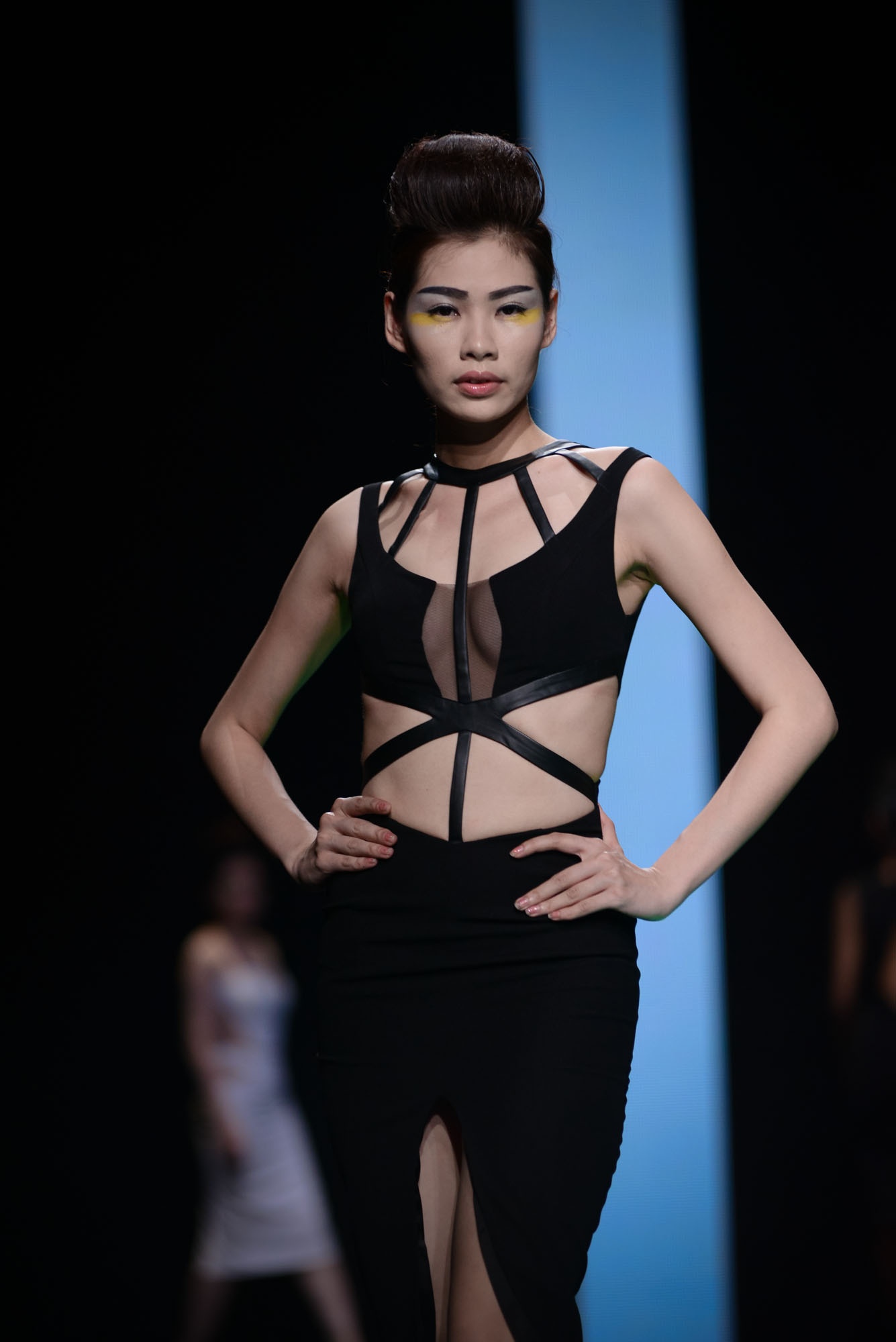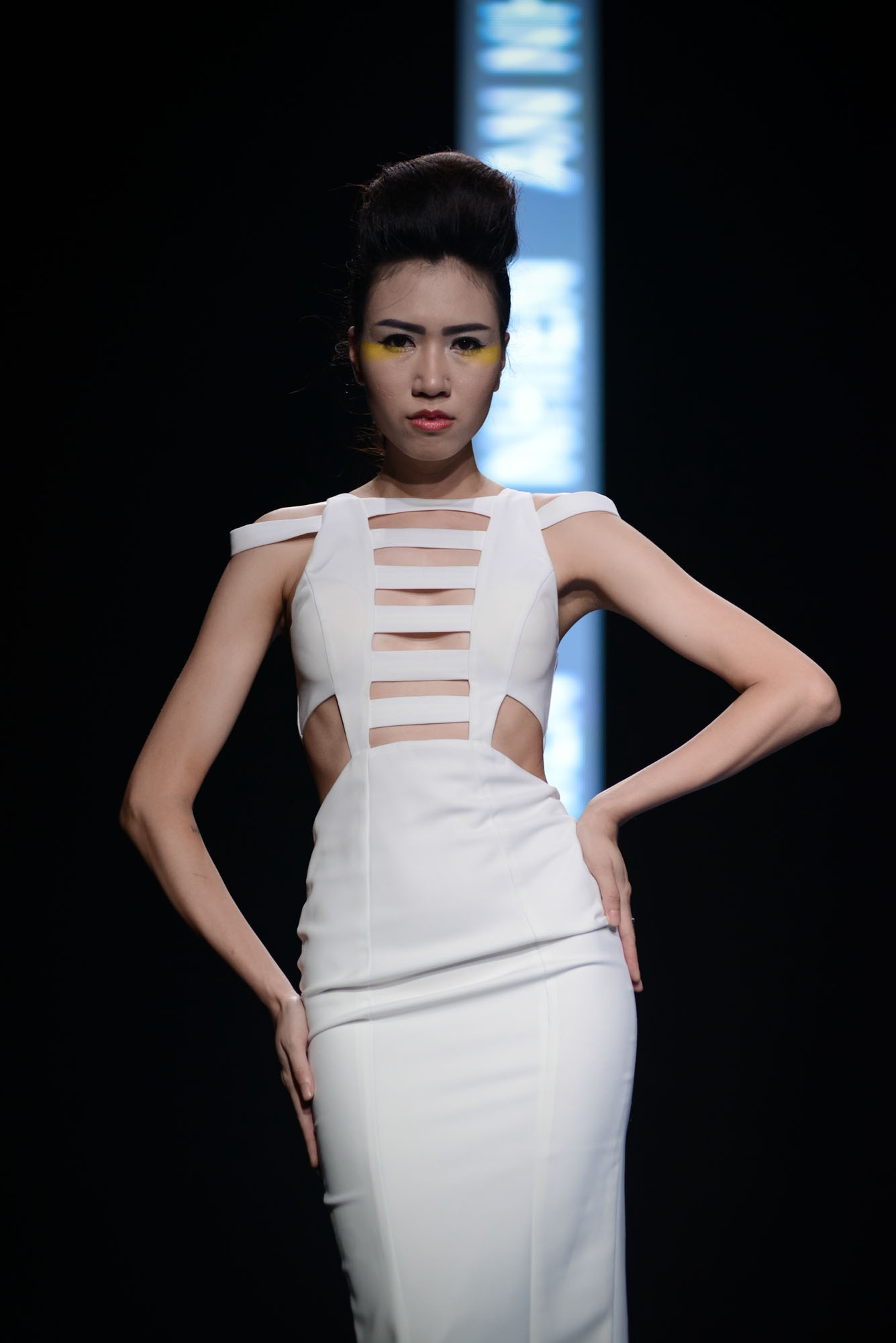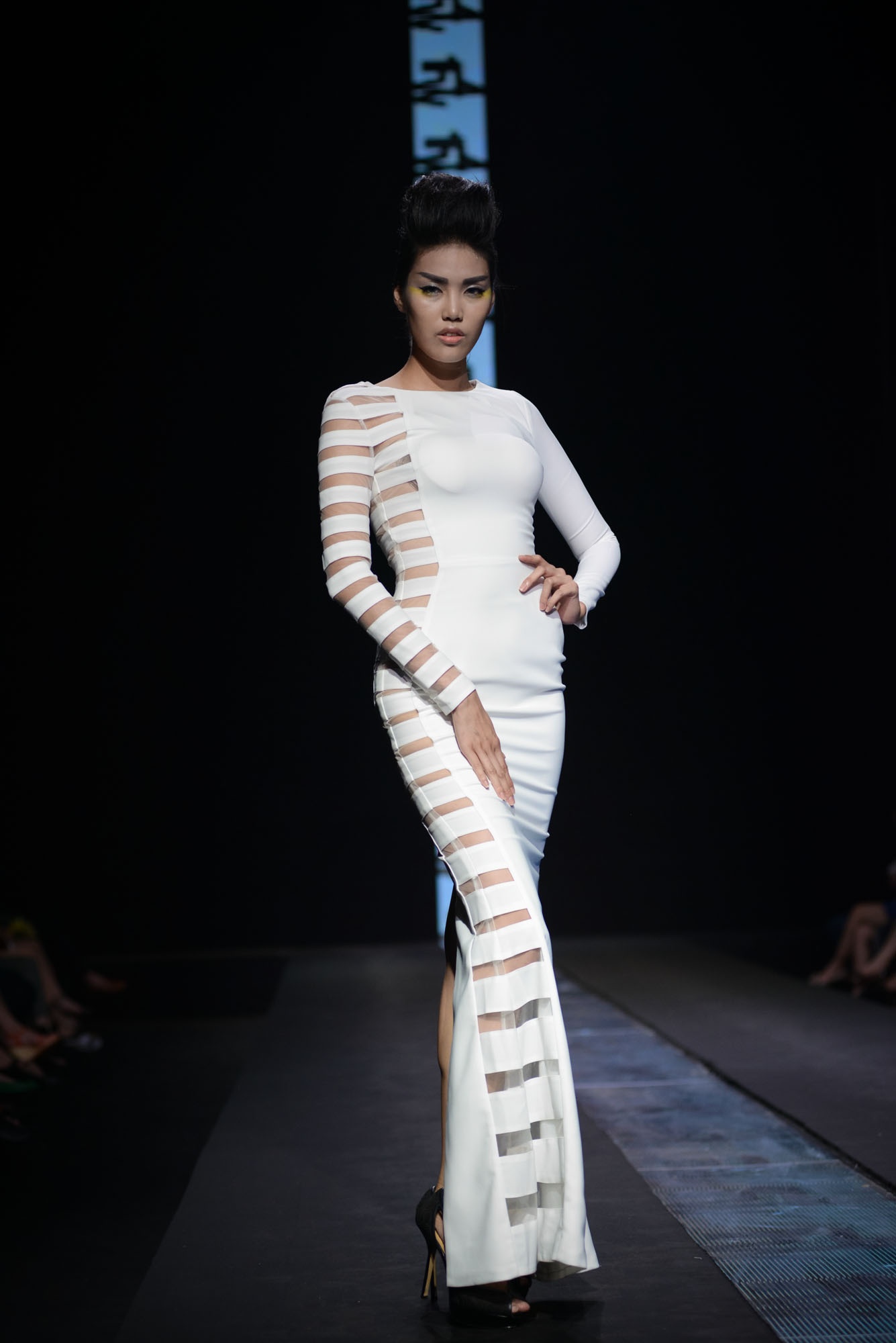 | Kha Mỹ Vân lạnh lùng trên sân khấu. Đường sọc ngang là điểm nhấn cá tính. |