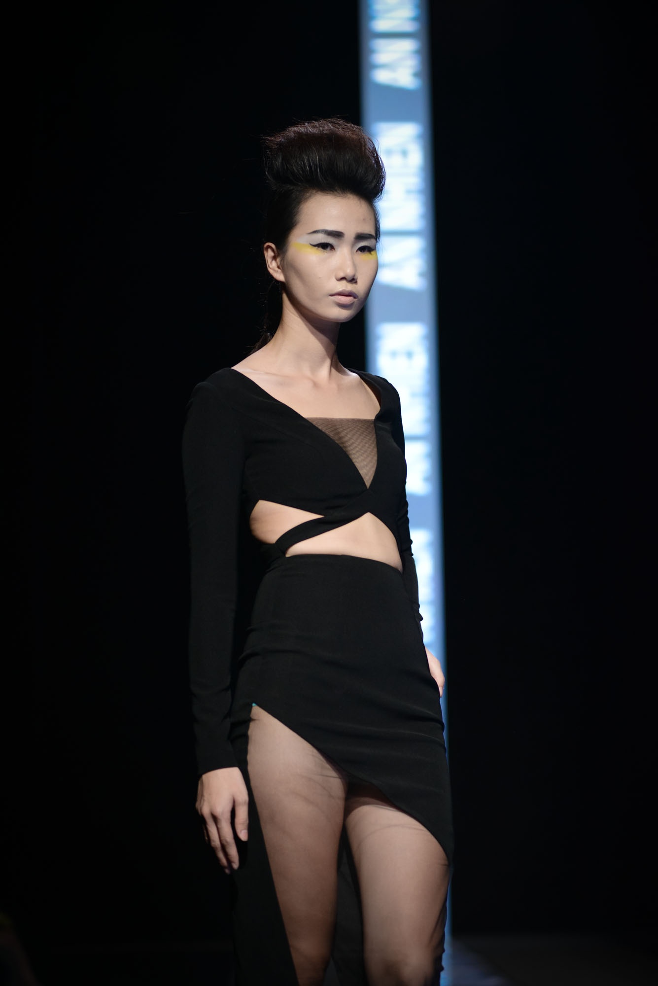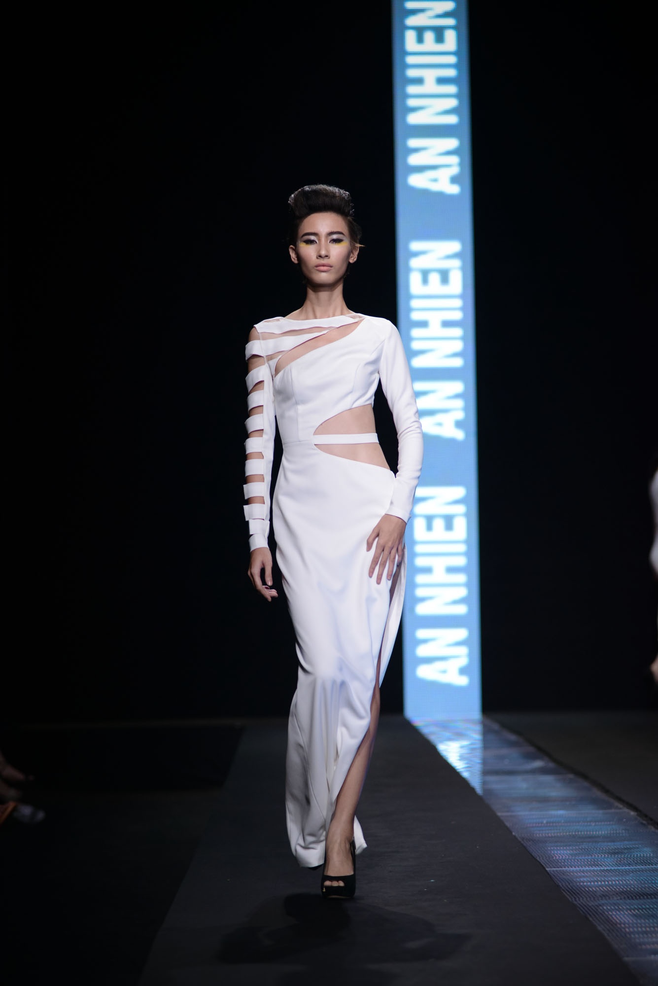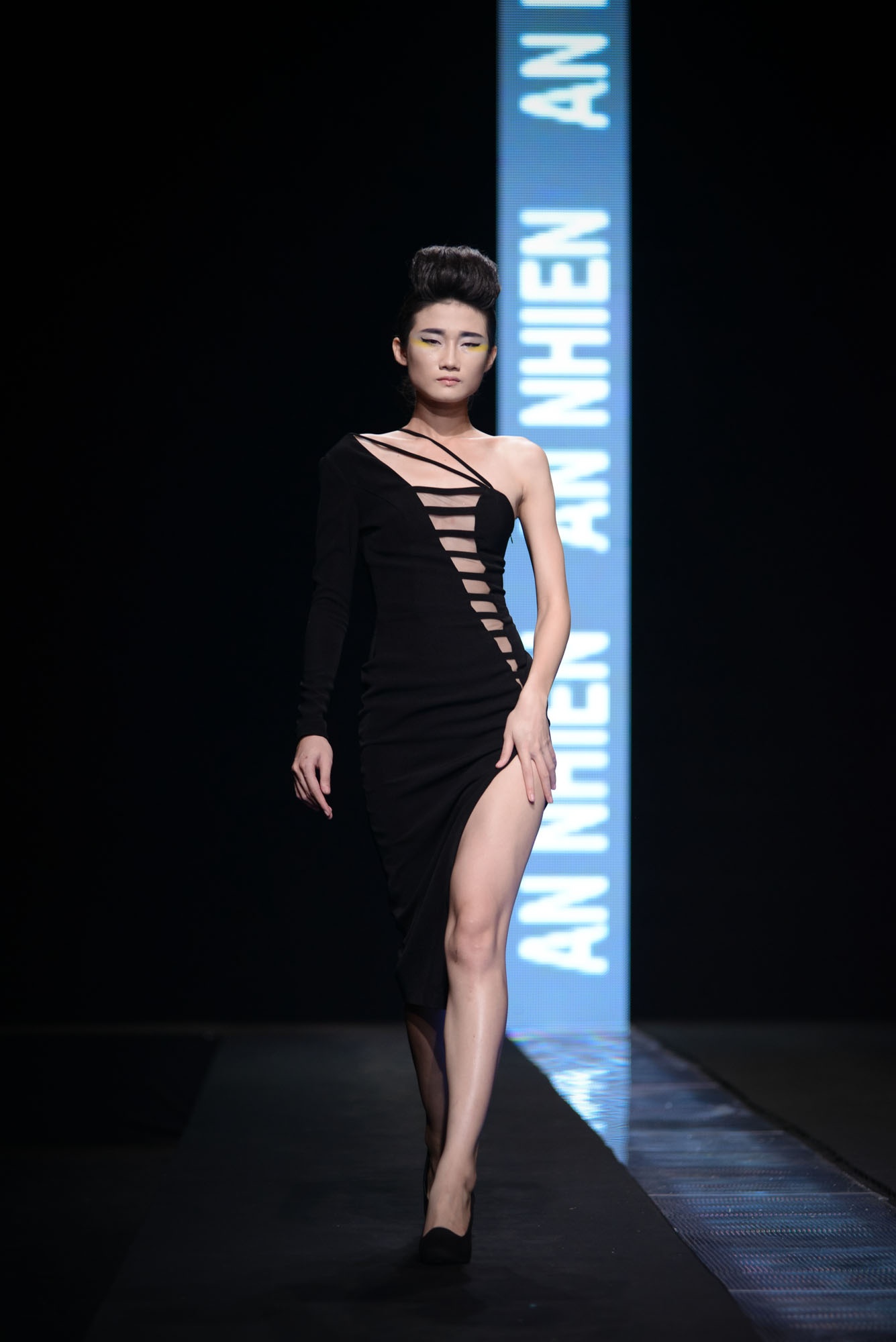BST của An Nhiên chú trọng gam màu tối, nổi bật lên là những đường cut-out mạnh mẽ tại vùng gợi cảm. Trang phục có đường cắt táo bạo là lợi thế của NTK, vì vậy ở bộ sưu tập này cô chú trọng đến những khoảng hở bạo tại thân áo và chân váy.