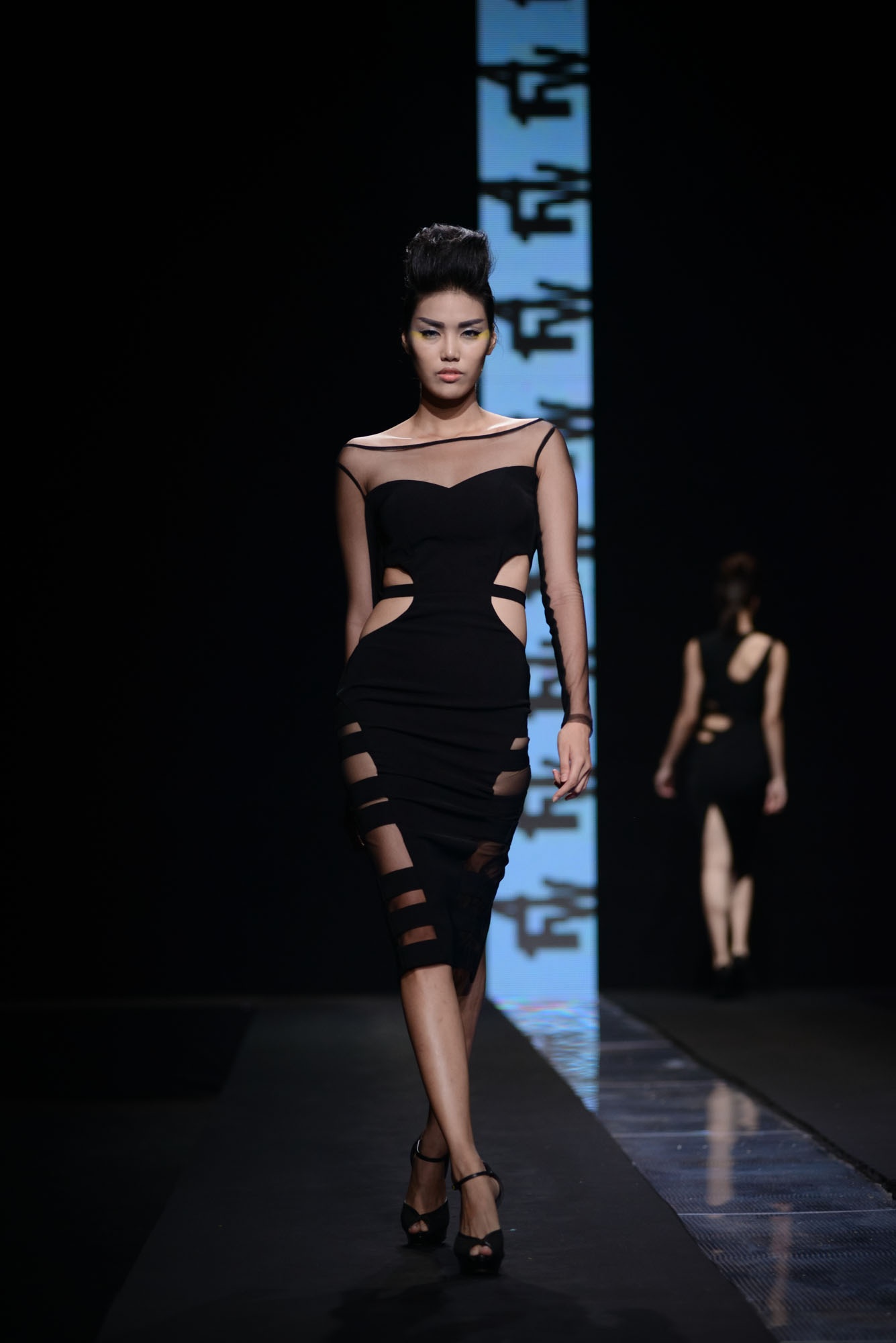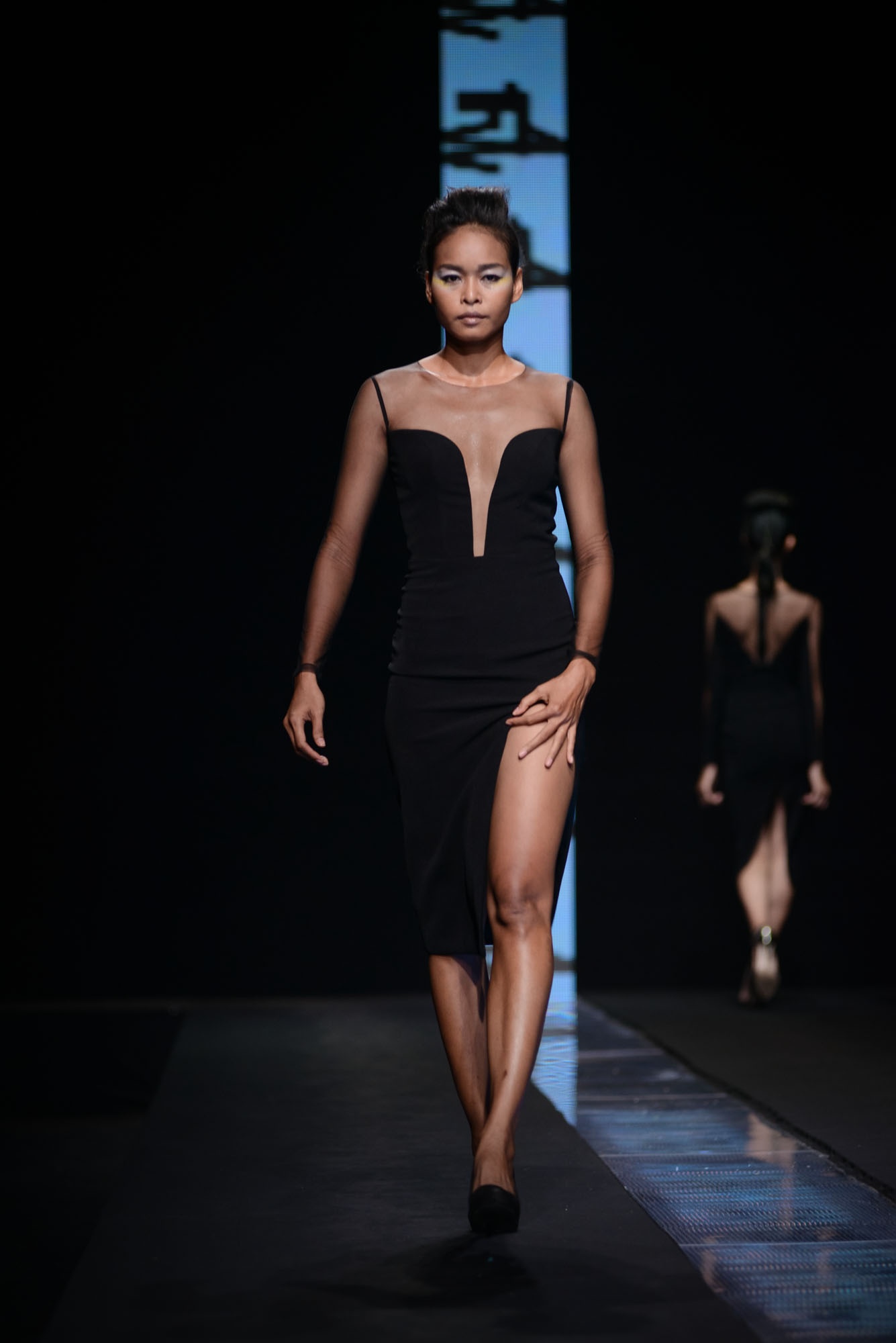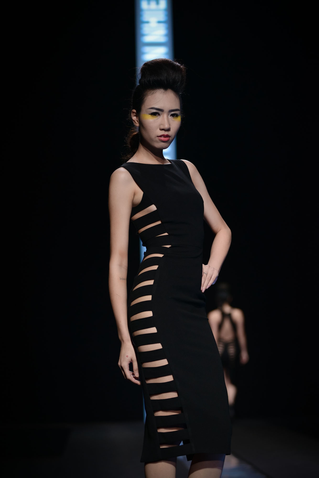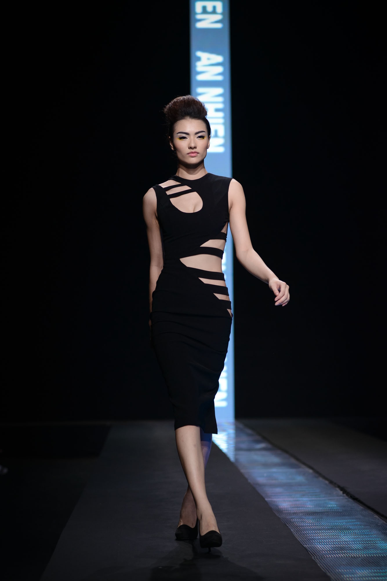 BST của An Nhiên chú trọng gam màu tối, nổi bật lên là những đường cut-out mạnh mẽ tại vùng gợi cảm. Trang phục có đường cắt táo bạo là lợi thế của NTK, vì vậy ở bộ sưu tập này cô chú trọng đến những khoảng hở bạo tại thân áo và chân váy.