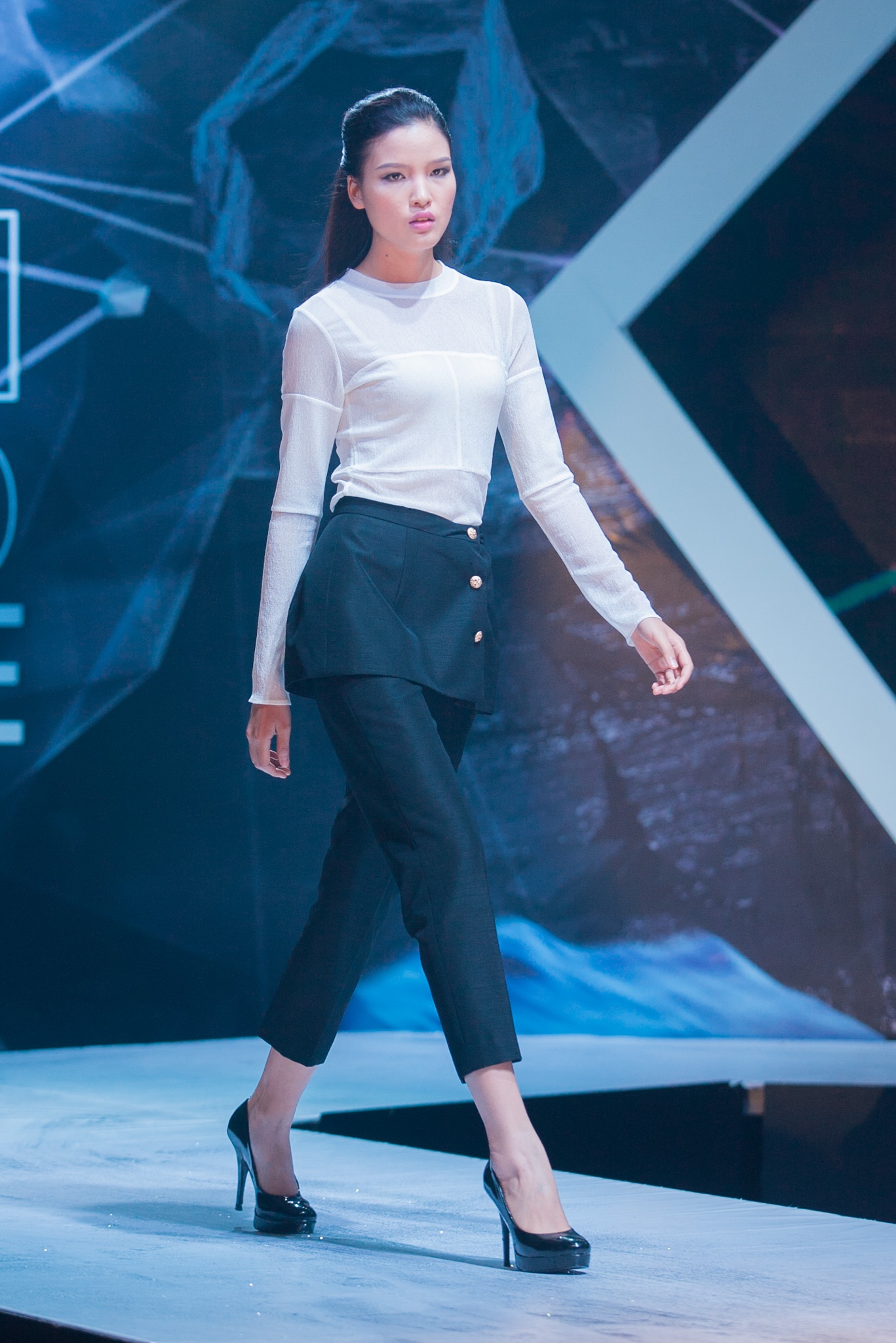 | Ngoài chi tiết cổ điển, BST còn hướng đến vẻ đẹp hiện đại, năng động của người mặc. Các thiết kế được mix tối giản nhưng không kém phần cá tính. Trong ảnh, Chà Mi kiêu sa trong set trang phục tông trắng đen. |