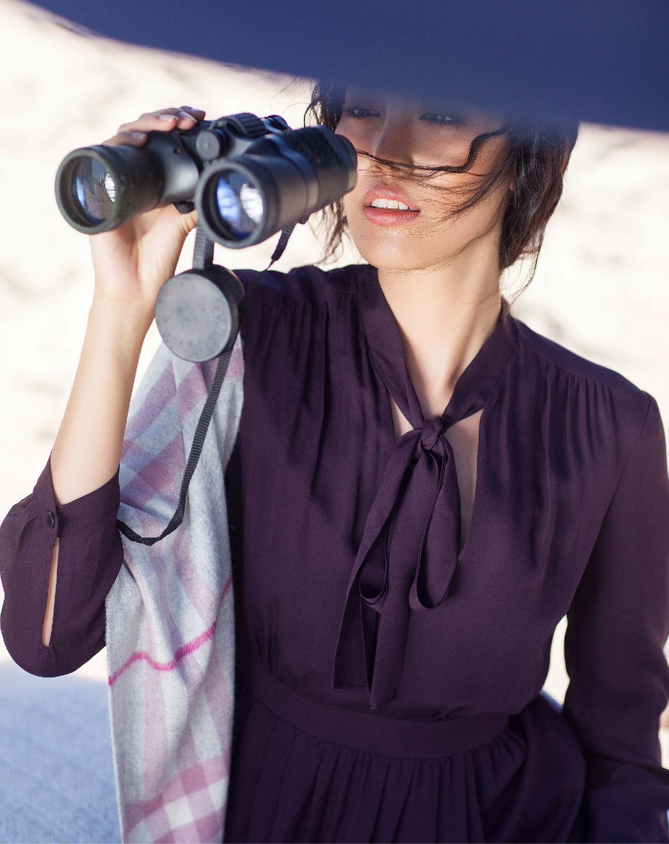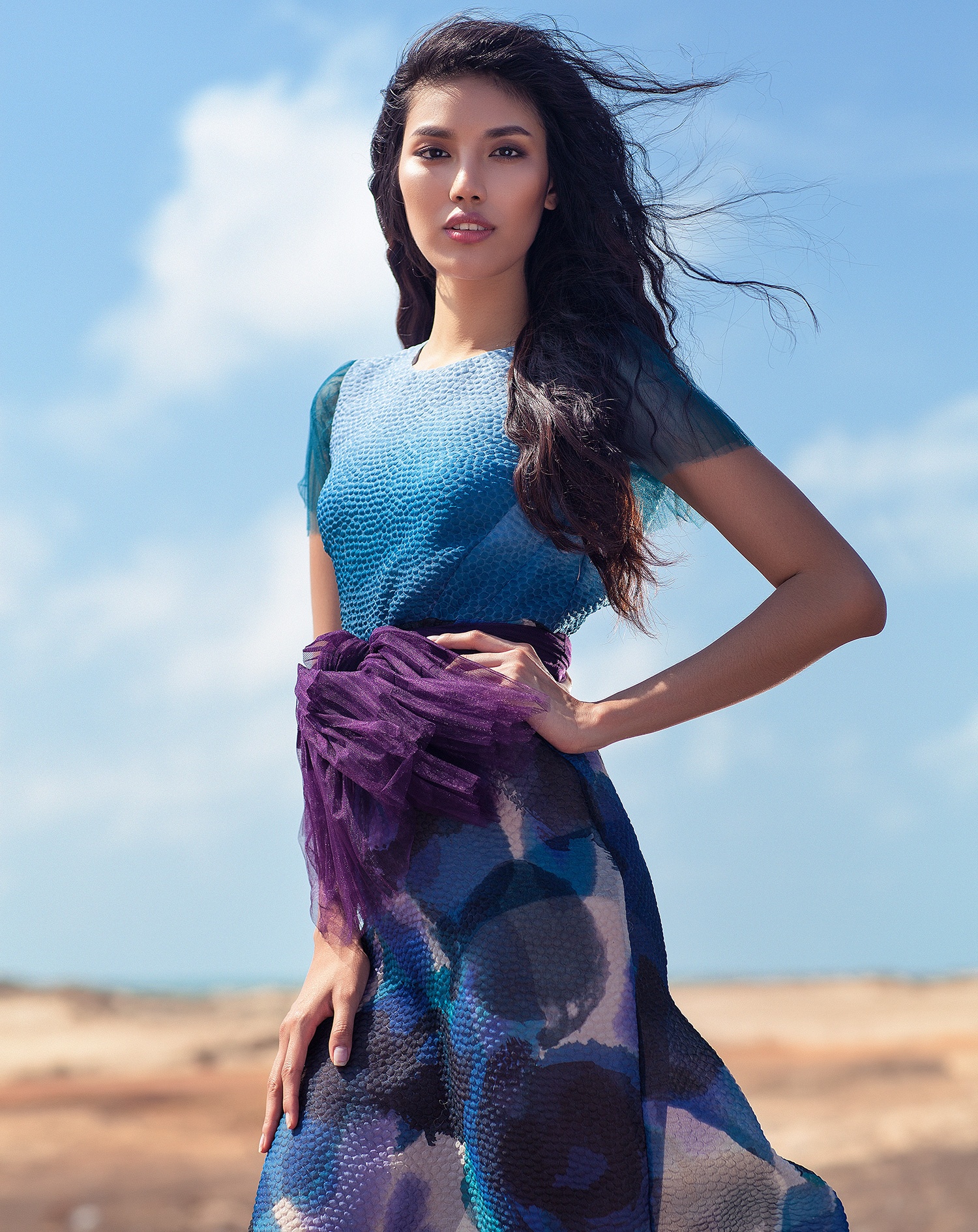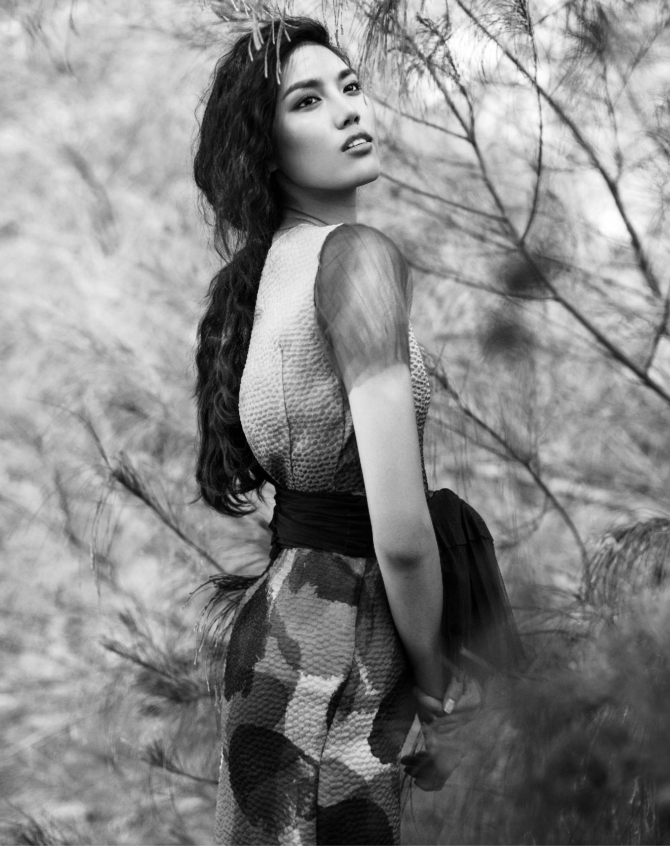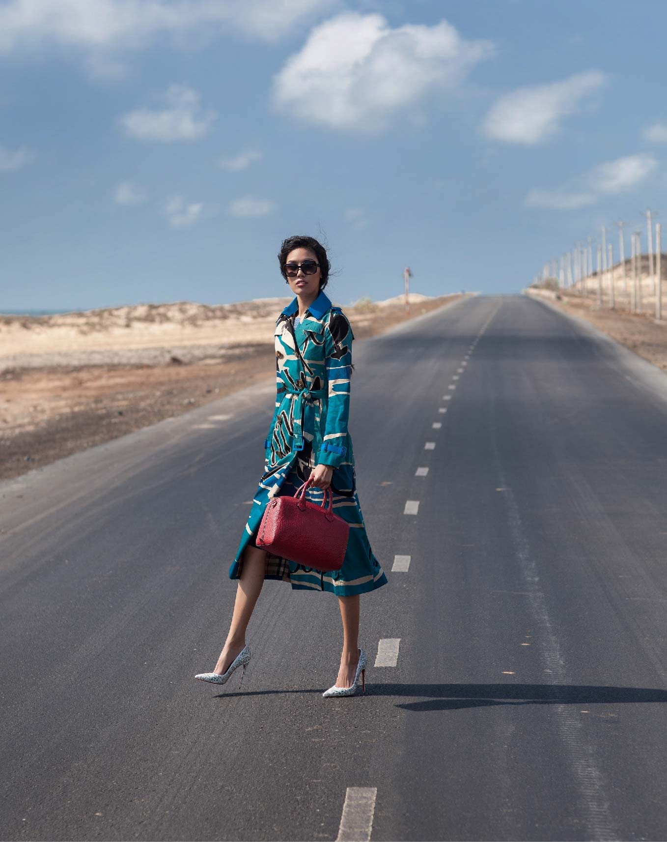 Cùng Burberry phiêu du đến miền nắng gió, Lan Khuê mang vẻ đẹp sang trọng và trang nhã qua chiếc áo trench coat cùng đầm lụa họa tiết sọc Haymarket đặc trưng của Burberry.