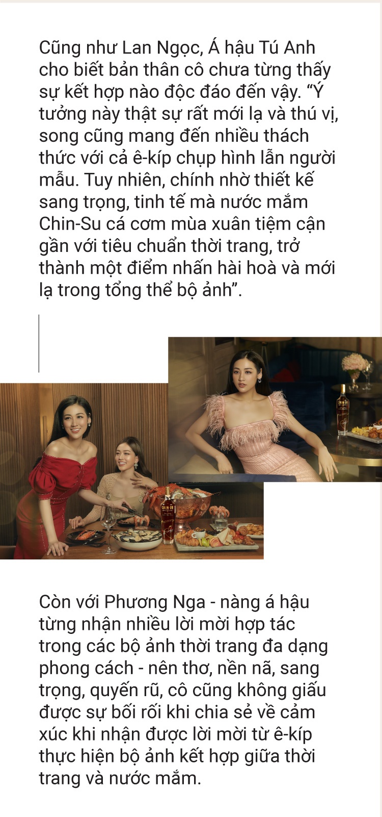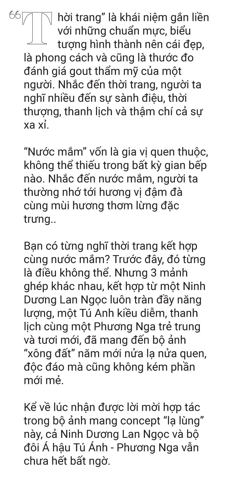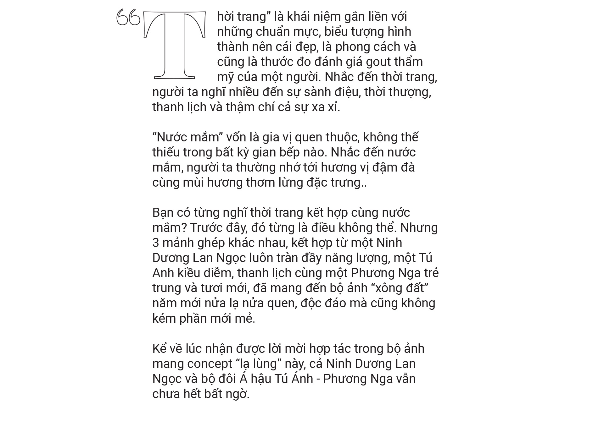 Một Ninh Dương Lan Ngọc luôn tràn đầy năng lượng, một Tú Anh kiều diễm, một Phương Nga trẻ trung, 3 con người, 3 cá tính, lần đầu kết hợp trong bộ ảnh thời trang đầy mới lạ.
