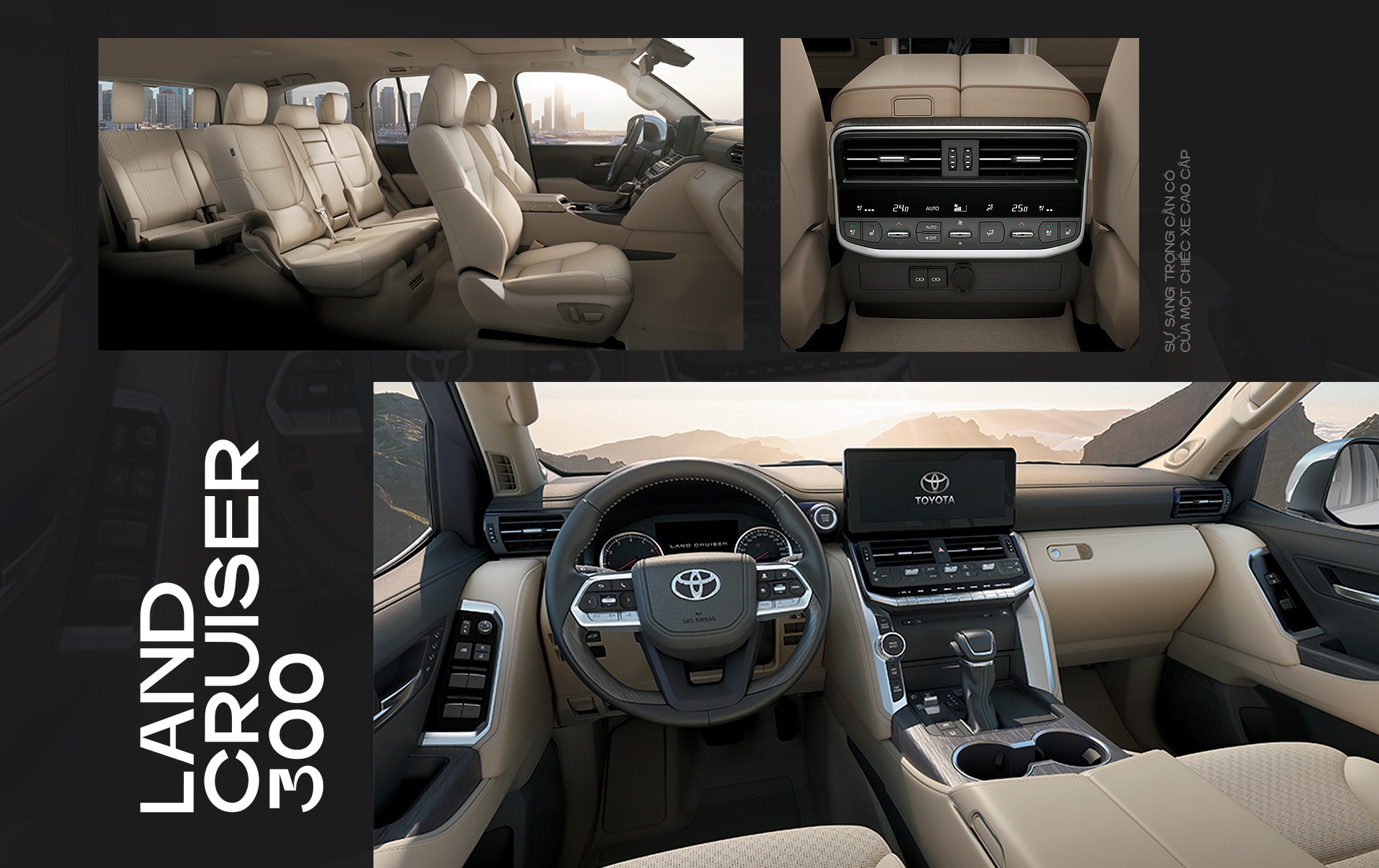 Xác định rõ tập khách hàng là những người có vị thế trong xã hội, Land Cruiser 300 mang đến loạt trang bị cao cấp. Với kích thước đồ sộ 4.965 x 1.980 x 1.945 mm (dài x rộng x cao), Land Cruiser 300 sở hữu khoang xe rộng rãi, thoải mái cho người dùng. Đồng thời, diện tích khoang hành lý rộng hơn khi tăng tới 250 mm. Xe có 3 hàng ghế, trong đó, hàng ghế thứ 2 và 3 có thể gập lại dễ dàng để tối ưu không gian sử dụng.