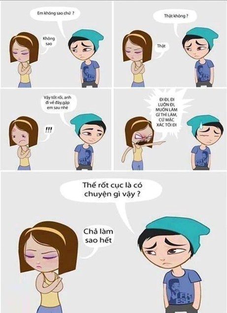 Tình huống: Chợt một ngày thấy gái im lìm, buồn bã, hoặc để status facebook đầy tâm trạng. Trai vào hỏi thăm thì “Em không sao cả!”