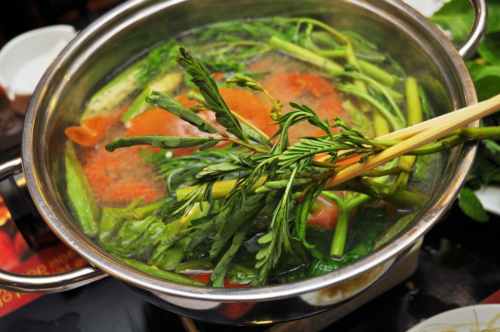 Lẩu ăn kèm mồng tơi với rau nhút.