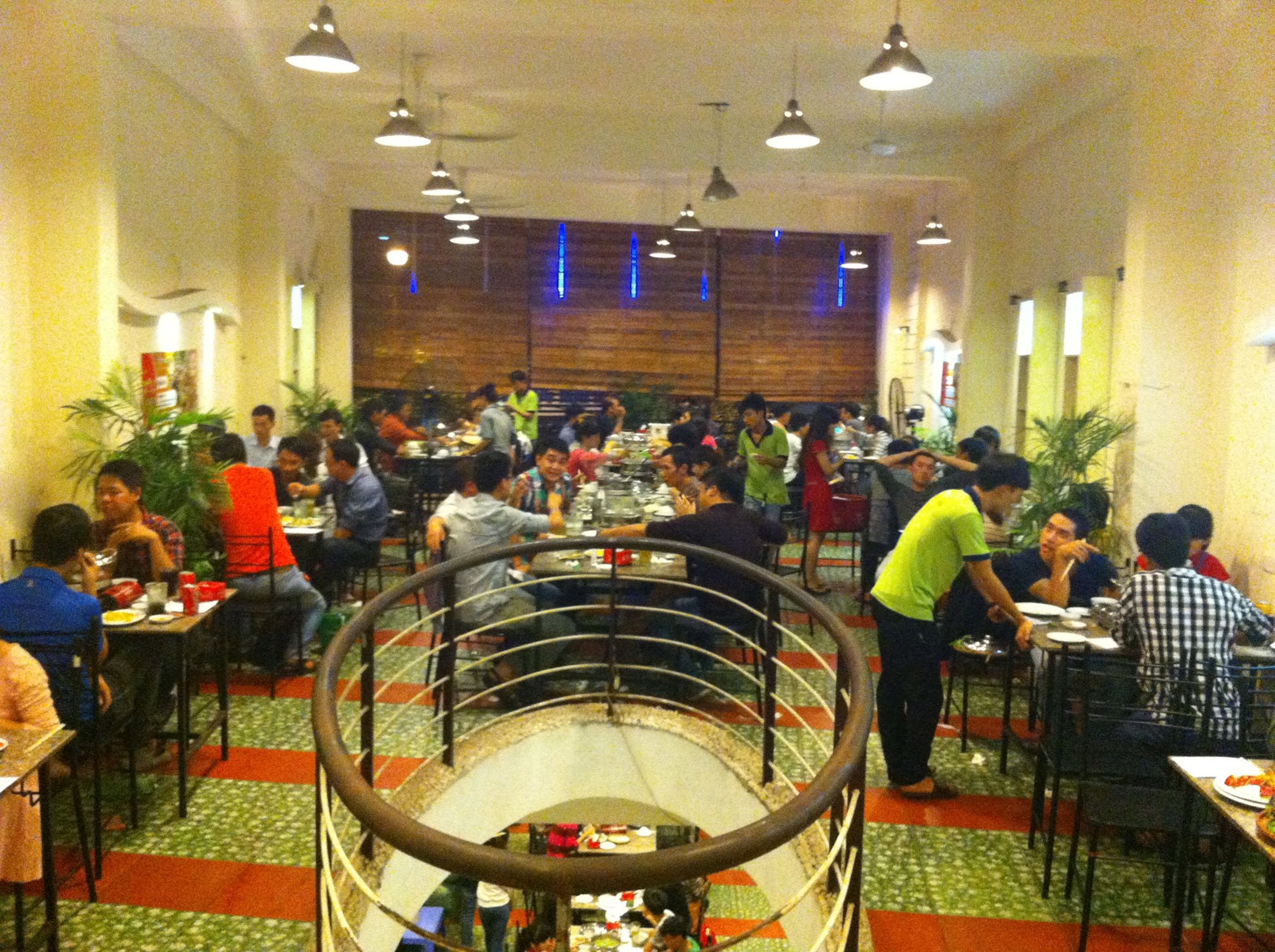 Những vị khách đa phần là những bạn trẻ đến đây thưởng thức lẩu 1 giá cùng người thân và bạn bè. Không khó để bắt gặp các đôi tình nhân cười đùa vui vẻ bên nhau, những nhóm bạn nâng cốc chúc tụng giữa nồi lẩu nghi ngút khói. Lác đác có vài bàn dài đến ba mươi bốn mươi người đang liên hoan ở khu vực ngoài trời trên tầng ba.