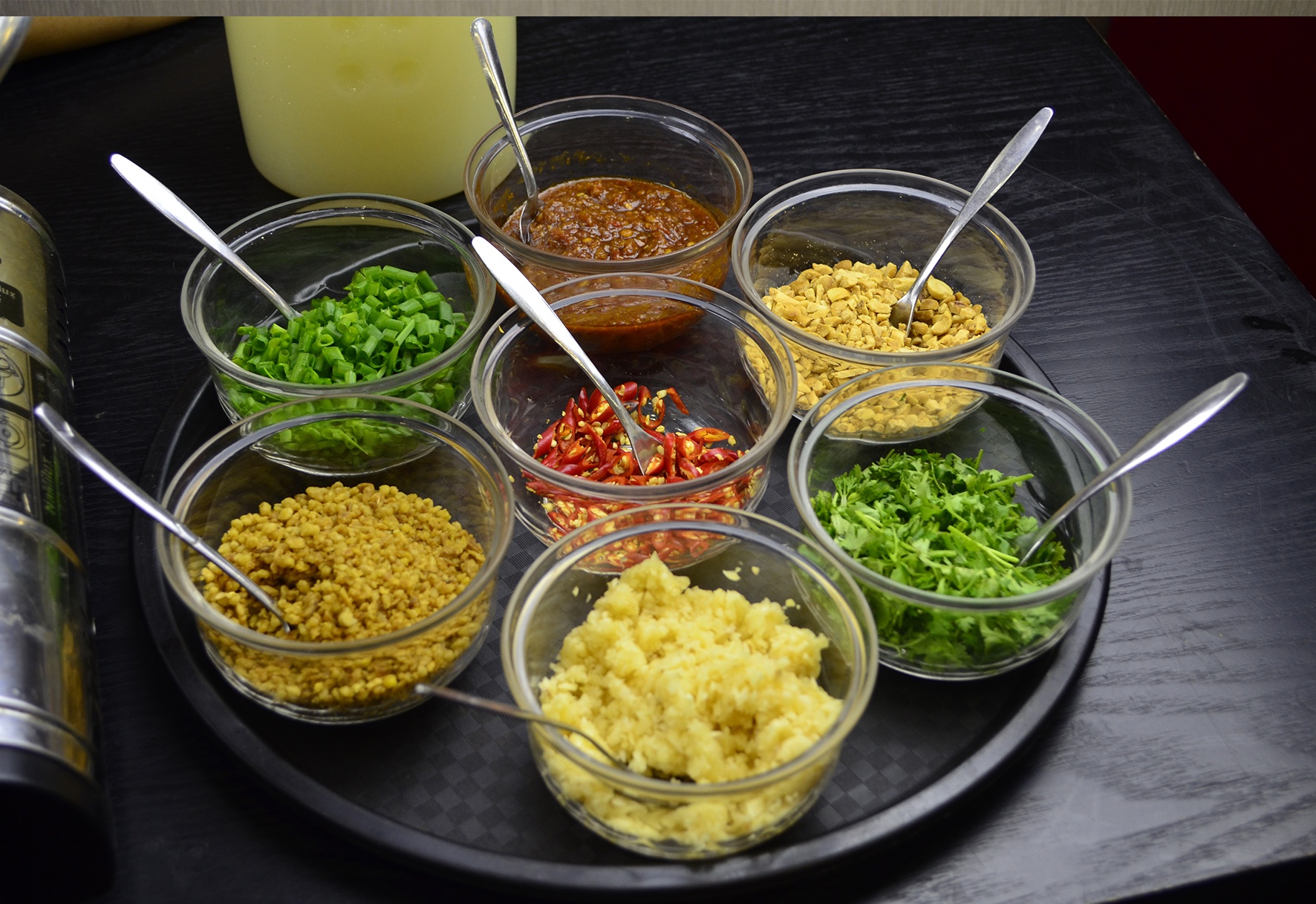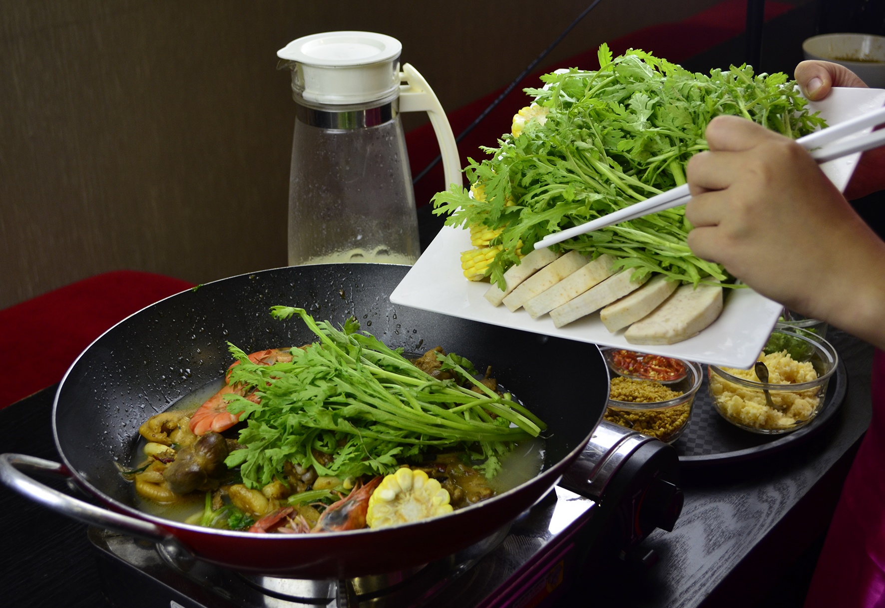 | Trong khi chờ đợi món ăn, bạn được hướng dẫn pha nước chấm từ 7 loại gia vị: sa tế, tỏi bằm nhuyễn, tỏi phi, ớt, hành, ngò, đậu phộng. Bạn sẽ gia giảm các loại gia vị này với xì dầu, tạo thành món nước chấm riêng. |
