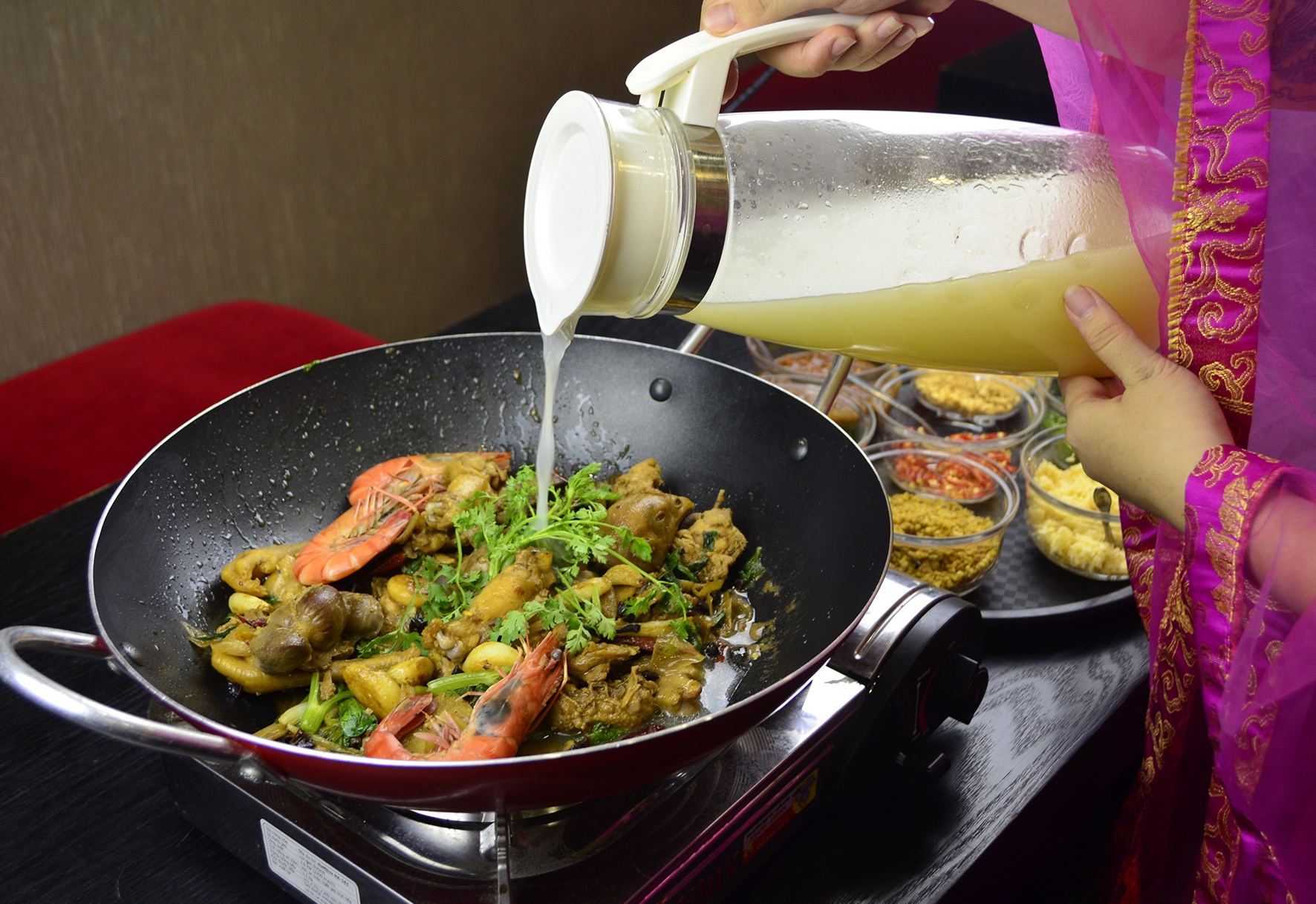 Khi có lẩu, bạn xào tiếp từ 5-7 phút để thịt gà chín hẳn, thấm đều gia vị. 14 loại gia vị đều được nhập khẩu và pha chế theo công thức của một quán ăn có món lẩu khô nổi tiếng ở Hong Kong.