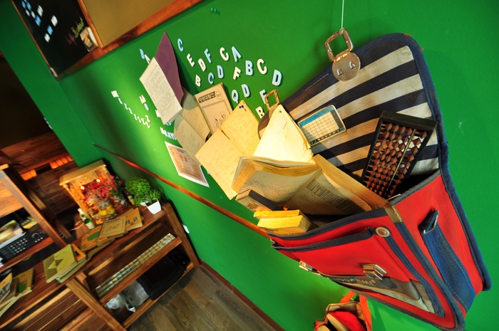 Thiết kế nơi này không giống như những quán ăn Hàn Quốc tôi từng đến. Vẫn là bàn ghế gỗ, ánh đèn vàng, nhưng lạ hơn với bảng đen, cặp sách, vở viết, bảng tính…