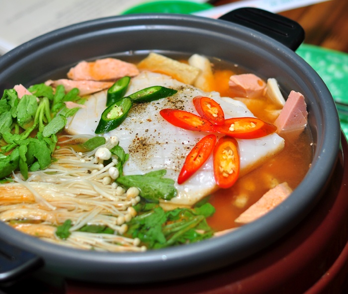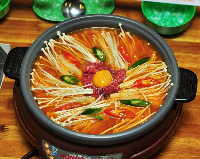 Thực đơn của quán còn khá nhiều món Hàn nhưng lẩu có vẻ được khách ủng hộ nhất. Quán có 2 món lẩu nữa rất đắt hàng. Một là lẩu kim chi đang “hot” trong mùa đông này nhờ hương vị chua cay dễ thưởng thức, đồ cũng phong phú với thịt bò, trứng, xúc xích, kim chi, nấm kim châm với giá khoảng 350.000 đồng đủ cho 2-3 người.