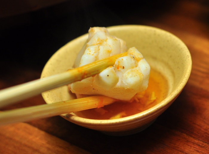 Ở đây, người ta không dùng gia vị chanh hay xì dầu mà sử dụng nước mắm gừng tươi làm nước chấm. Miếng mực ngọt giòn, sần sật chấm nước mắm gừng thơm thơm thực sự chinh phục tôi. Đó là chưa kể tới cảm giác được cắn ngập răng.