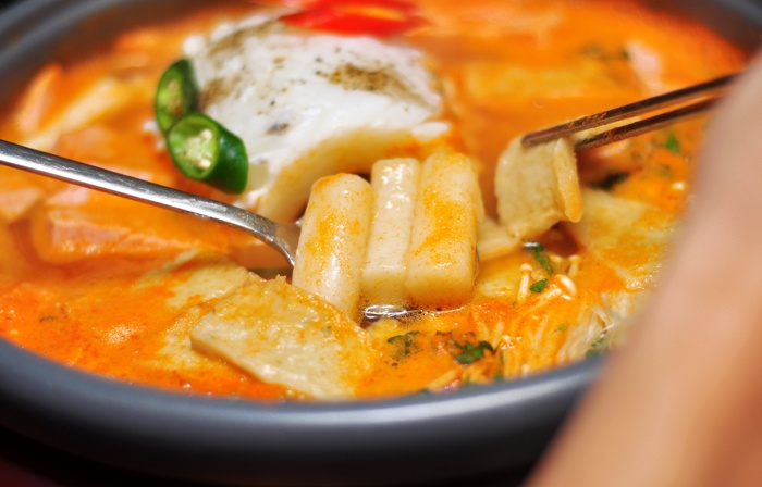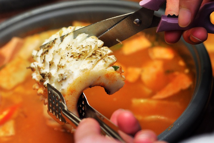 Thử với mực “khủng” xong, tôi bắt đầu “lùa” các món khác. Nhân viên quảng cáo rằng có chả cá, pa-tê, bánh gạo, tất cả đều đúng kiểu Hàn Quốc. Pa-tê mềm mịn, chả cá dai dai, bánh gạo dẻo bùi, hương vị không đến mức lôi cuốn nhưng vui miệng và khác lạ hơn những món lẩu thông thường. Cái hay của món lẩu là cứ bật bếp nóng vừa phải, kệ cho mọi món trong nồi hầm bao lâu cũng được, không sợ nhừ quá. Khách được vui vẻ trò chuyện, nhẩn nha thưởng thức mà không phải bận tâm chuyện chần với nhúng.