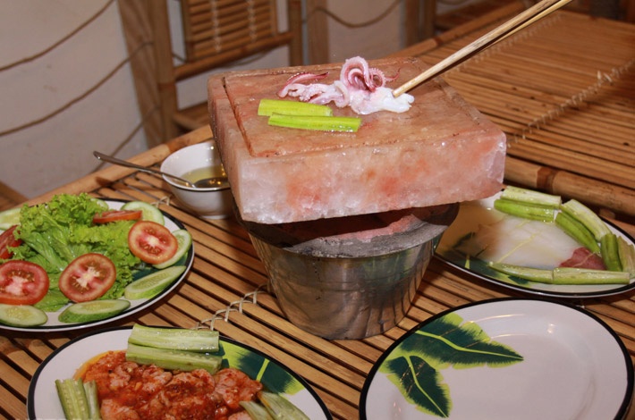 Nướng đá muối độc đáo tại Sài gòn, được lấy từ mỏ muối khoáng lớn thứ 2 thế giới tại Himalaya. Thực phẩm tươi ngon loại một, không tẩm ướp gia vị mà vẫn đậm đà vị mặn từ đá muối.