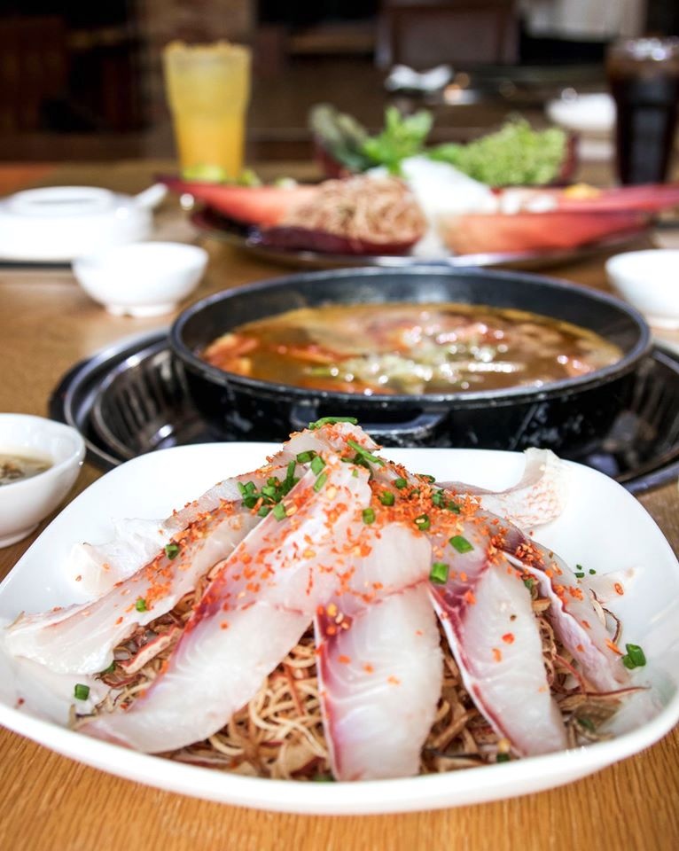 Người thưởng thức cho vào tô một ít bún tươi và các nguyên liệu đã được cắt sợi. Bạn nhúng cá vào nước lẩu ngọt vị rồi lấy ra tô, sau đó chan nước lẩu vừa ngập đến thức ăn, cho thêm bánh tráng đã bẻ vụn vào để cảm nhận trọn vẹn hương vị. Ảnh: Duduhapnuong. |