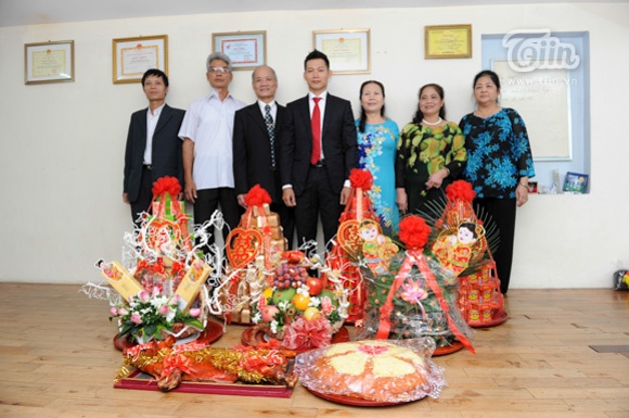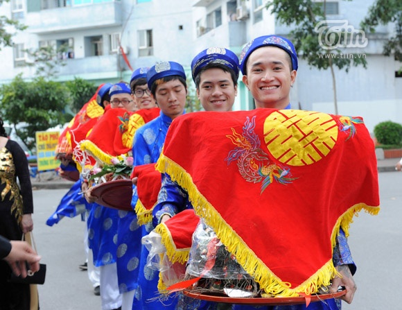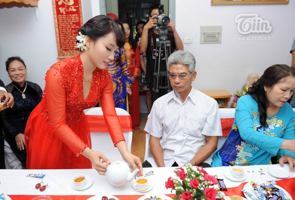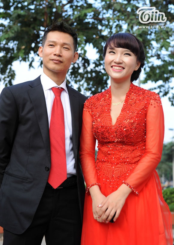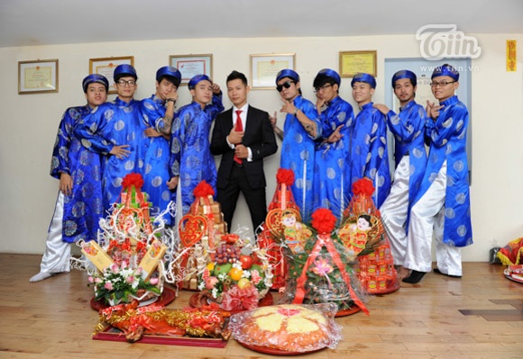Tuy đã chụp ảnh cưới khá lâu nhưng hôm qua trưởng nhóm Big Toe Nguyễn Viết Thành và vận động viên dance sport Chu Quỳnh Trang mới làm lễ ăn hỏi.