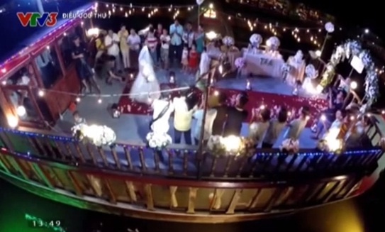 | Cô dâu, chú rể đang nắm tay nhau bước vào lễ đường đặc biệt trên du thuyền trong sự chào đón của rất nhiều bạn trẻ, người thực hiện chương trình. |