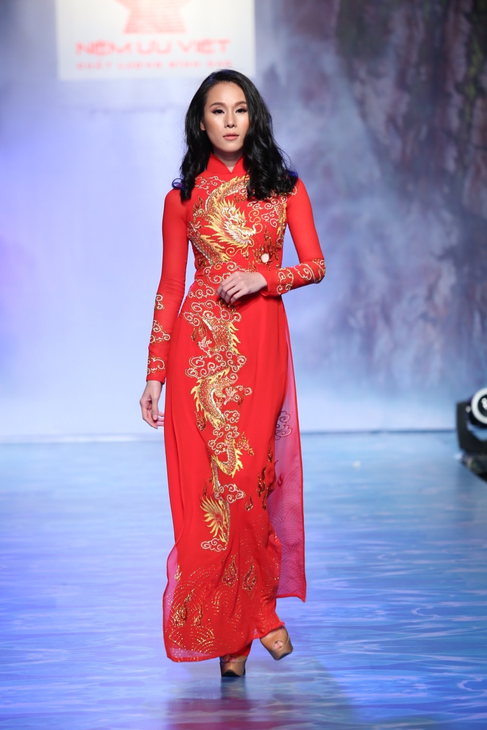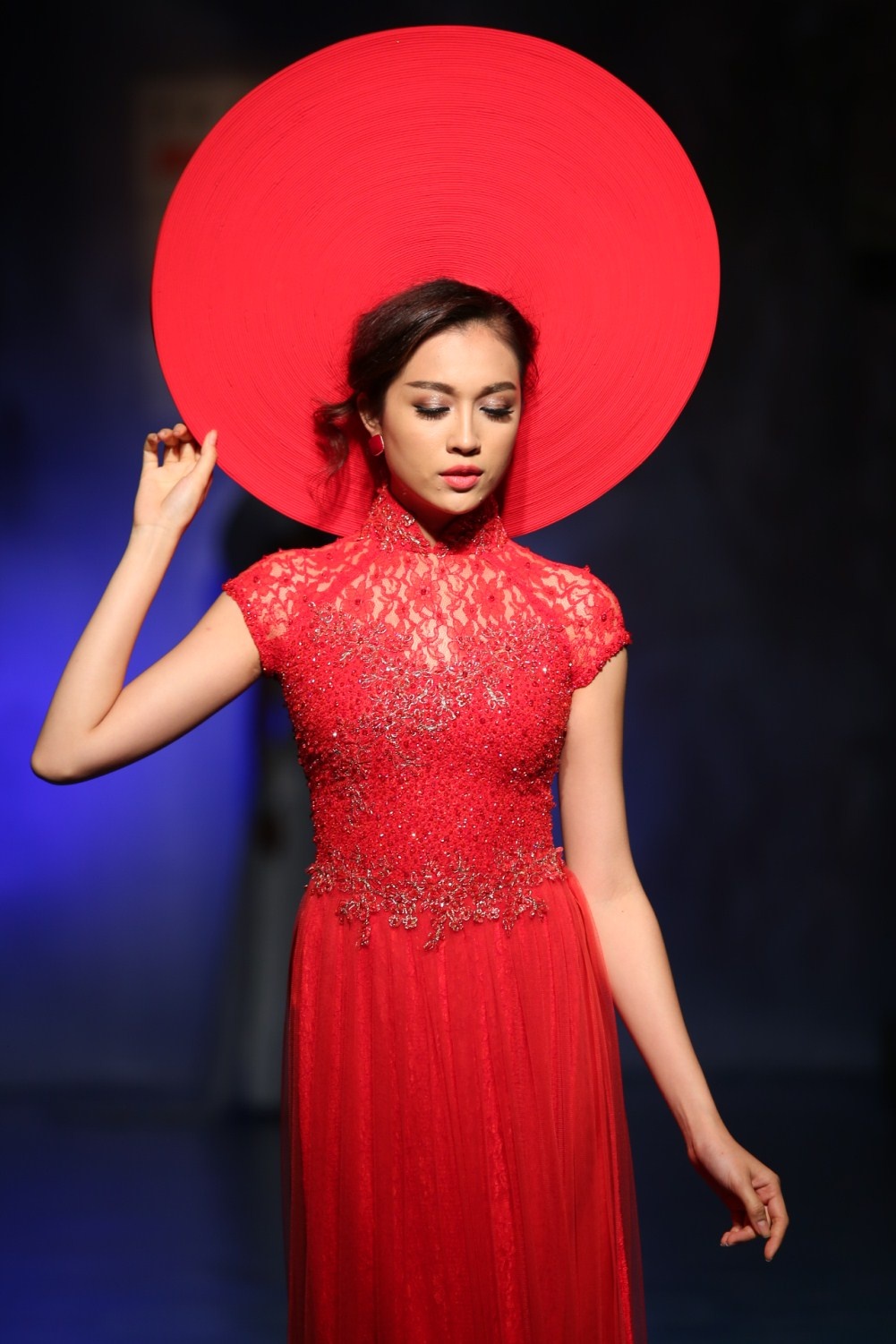 | Sau một thời gian vắng bóng, Thái Hà trở lại sàn diễn Phong cách trẻ. Người đẹp thể hiện áo dài cưới tông màu đỏ, được vẽ họa tiết rồng phượng cầu kỳ. |