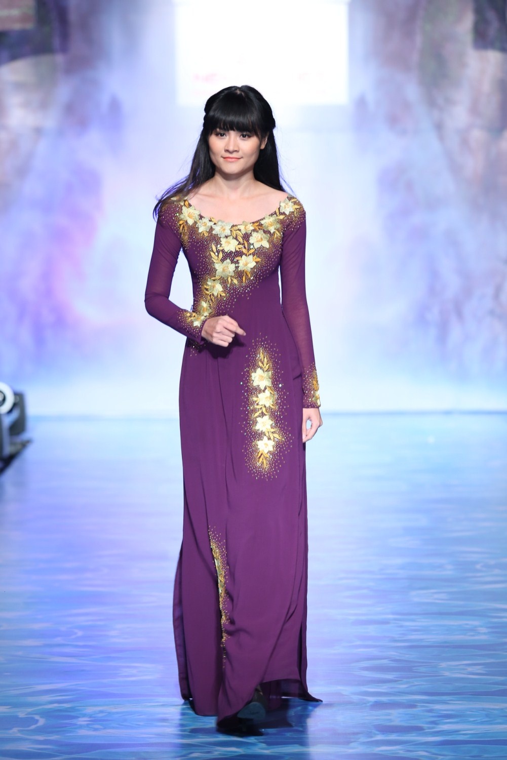 | Bộ sưu tập của Liên Hoàng khá đa dạng về màu sắc và kiểu dáng, đa phần đều hướng đến phong cách hiện đại, phù hợp với nhịp sống bận rộn. Lê Thị Phương quyến rũ trong bộ áo dài cách tân cổ thuyền. |