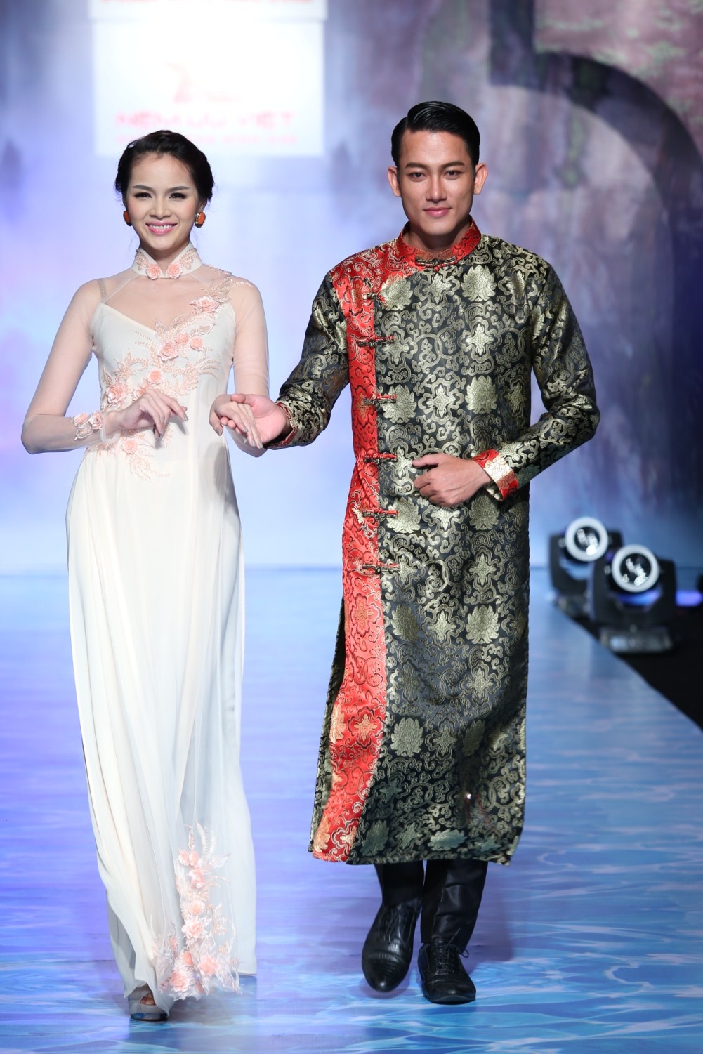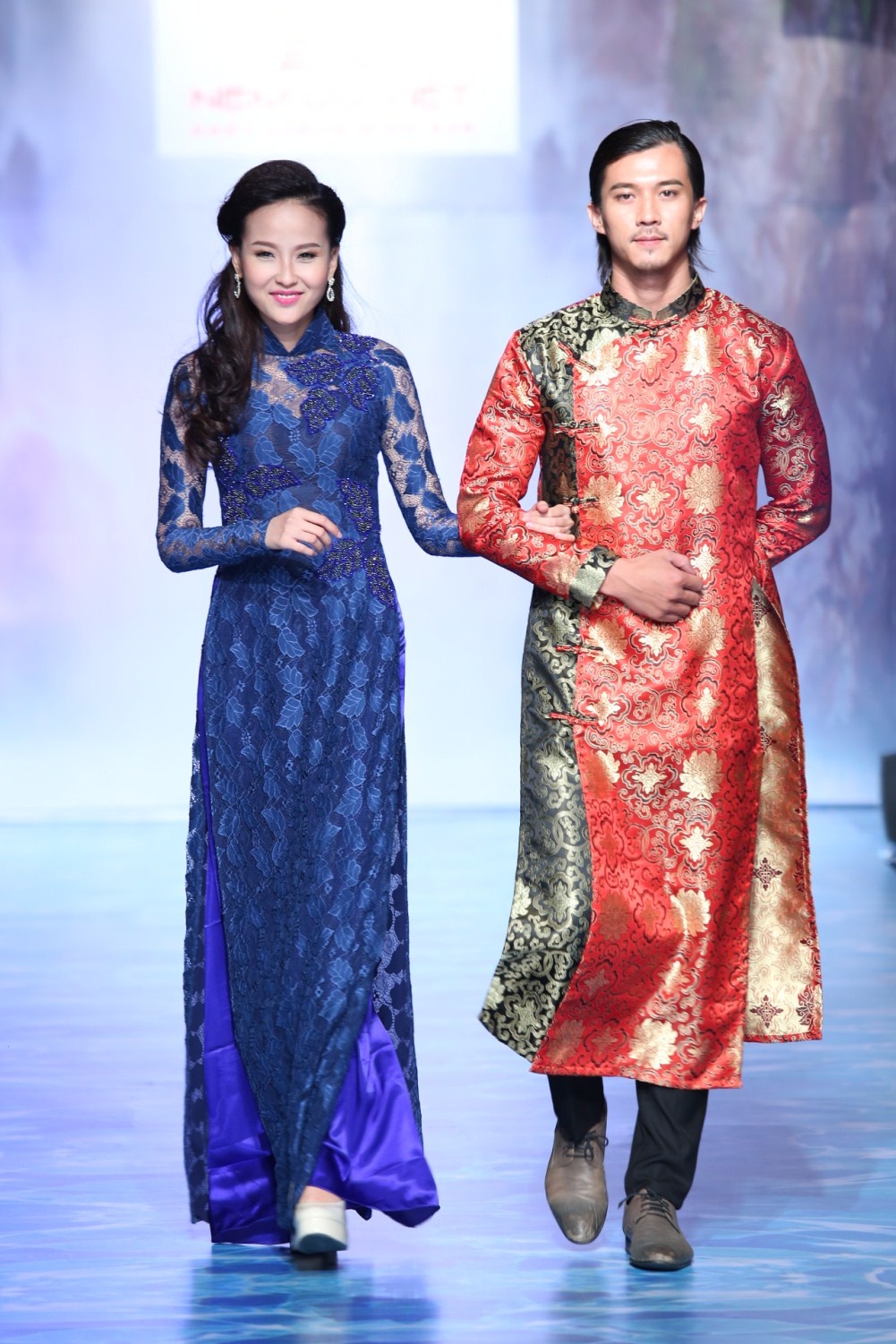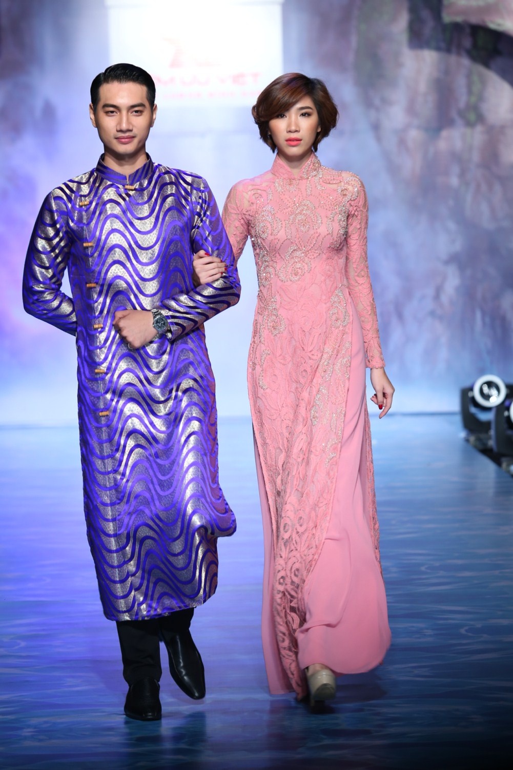 | Huỳnh Nu và Duy Linh cùng thể hiện mẫu áo dài dành cho cặp uyên ương. |