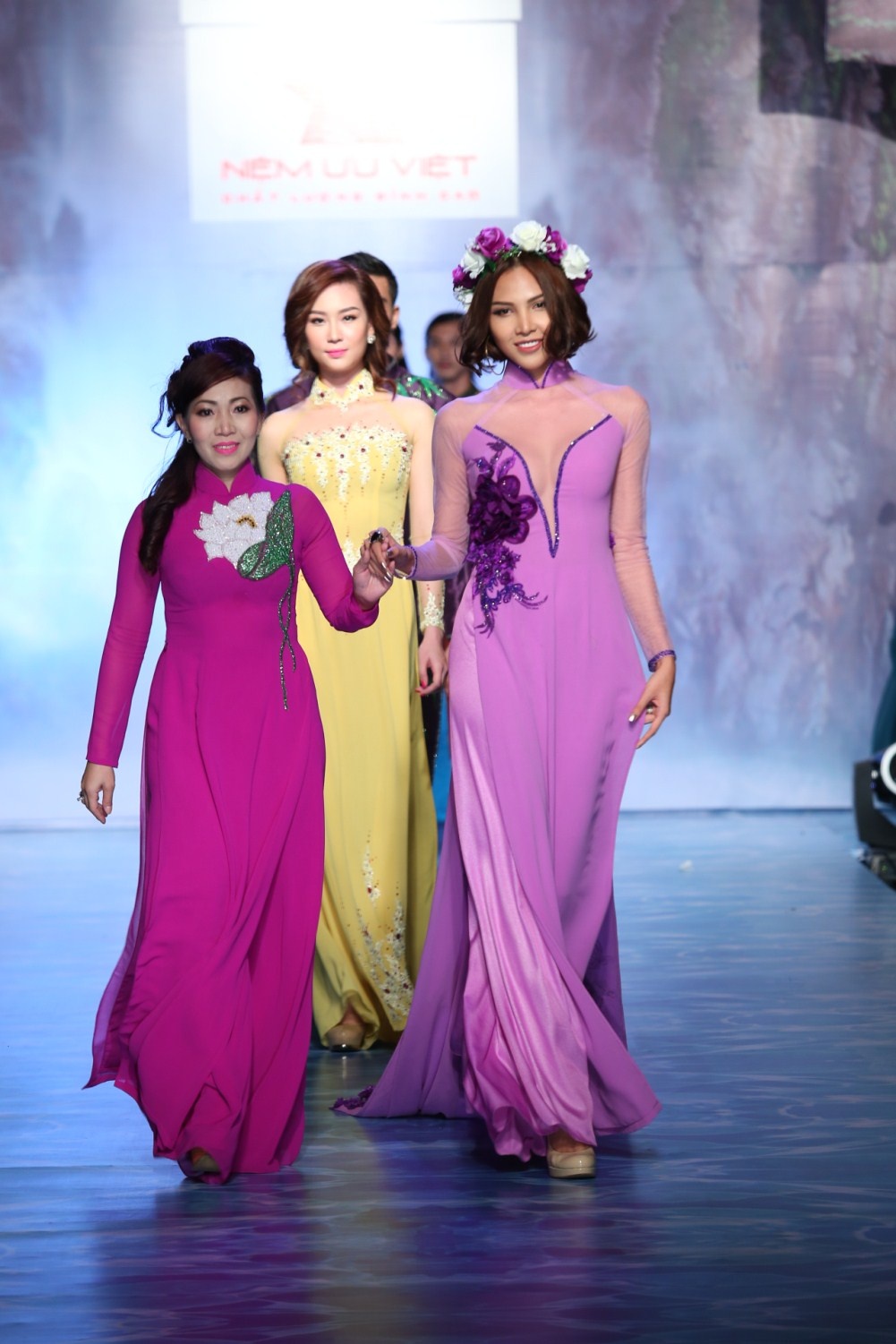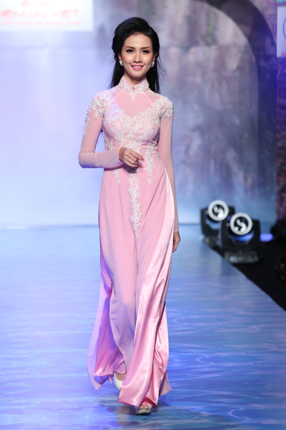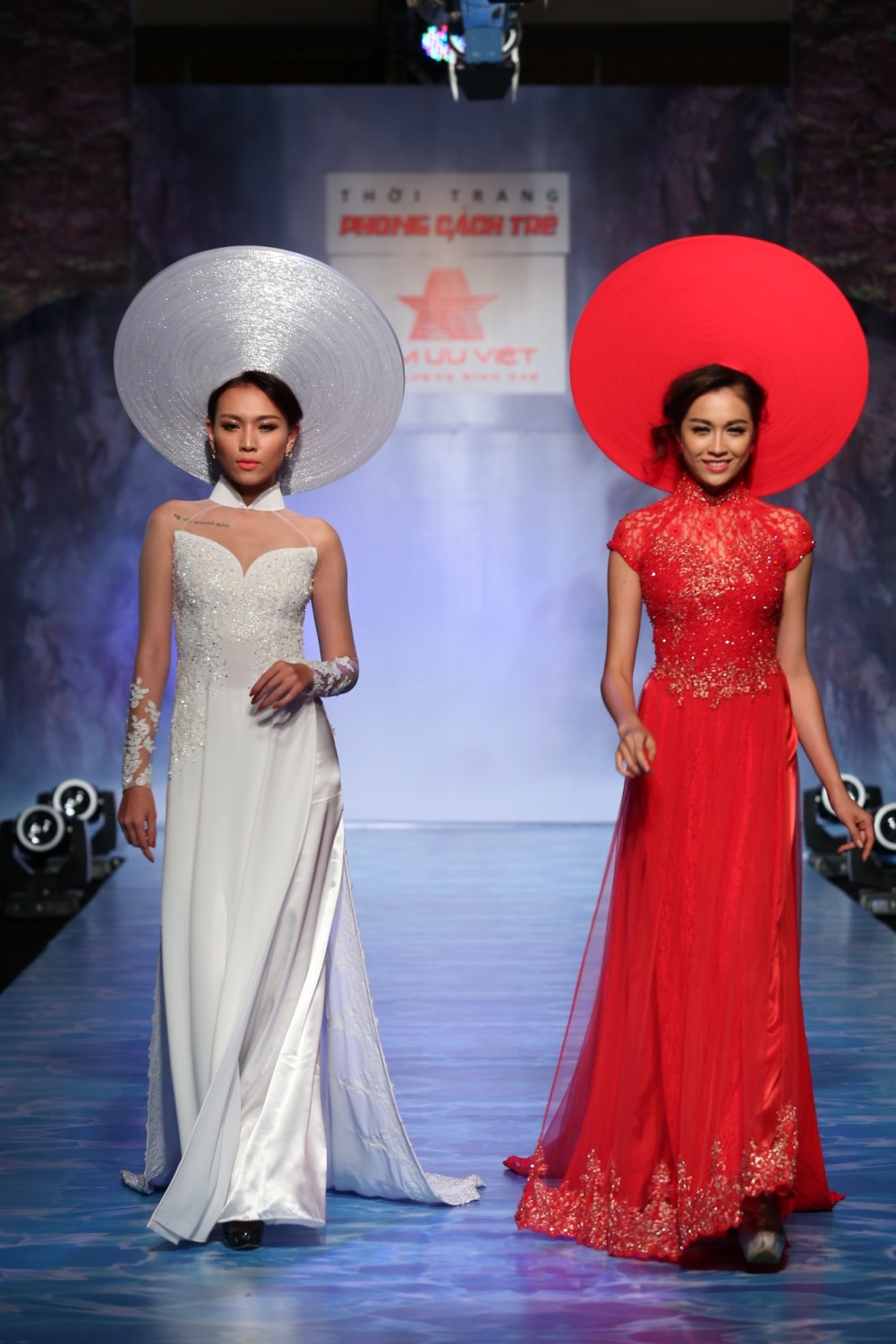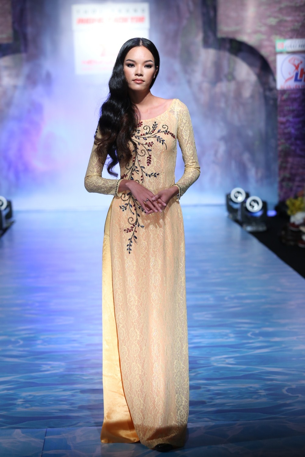 | Lệ Hằng và Diệu Huyền kết hợp ăn ý khi cùng xuất hiện ở phần mở màn. Trong khi giải bạc Siêu mẫu 2010 lịch thiệp trong mẫu áo dài trắng tinh tế, đính hạt tinh xảo thì Quán quân Elite Model Look nổi bật không kém cạnh với thiết kế áo dài cưới voan ren, đính kết hạt cườm tại thân áo, gấu váy. |