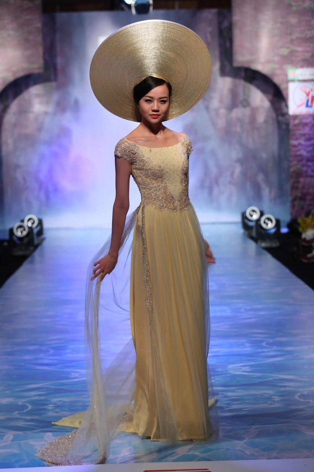 | Diệu Huyền và Lệ Hằng cùng đảm nhận vai trò first face, thể hiện BST áo dài cưới của Liên Hoàng với phong cách kiêu sa, quyến rũ. Phụ kiện mấn đội đầu khá lớn khiến cặp người mẫu khó khăn khi di chuyển, song đây là là điểm nhấn khá ấn tượng trên sàn diễn. |