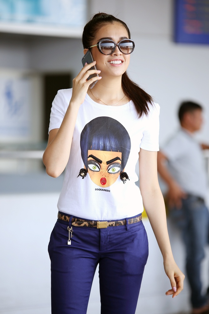 | Nữ người mẫu 19 tuổi diện trang phục áo thun, quần jeans ôm đơn giản nhưng vẫn nổi bật một góc sân bay Tân Sơn Nhất. Cô tươi cười rạng rỡ và cho biết, sau một thời gian tập luyện và giảm cân thành công, cô rất tự tin khi bước lên sàn đấu nhan sắc quốc tế. |